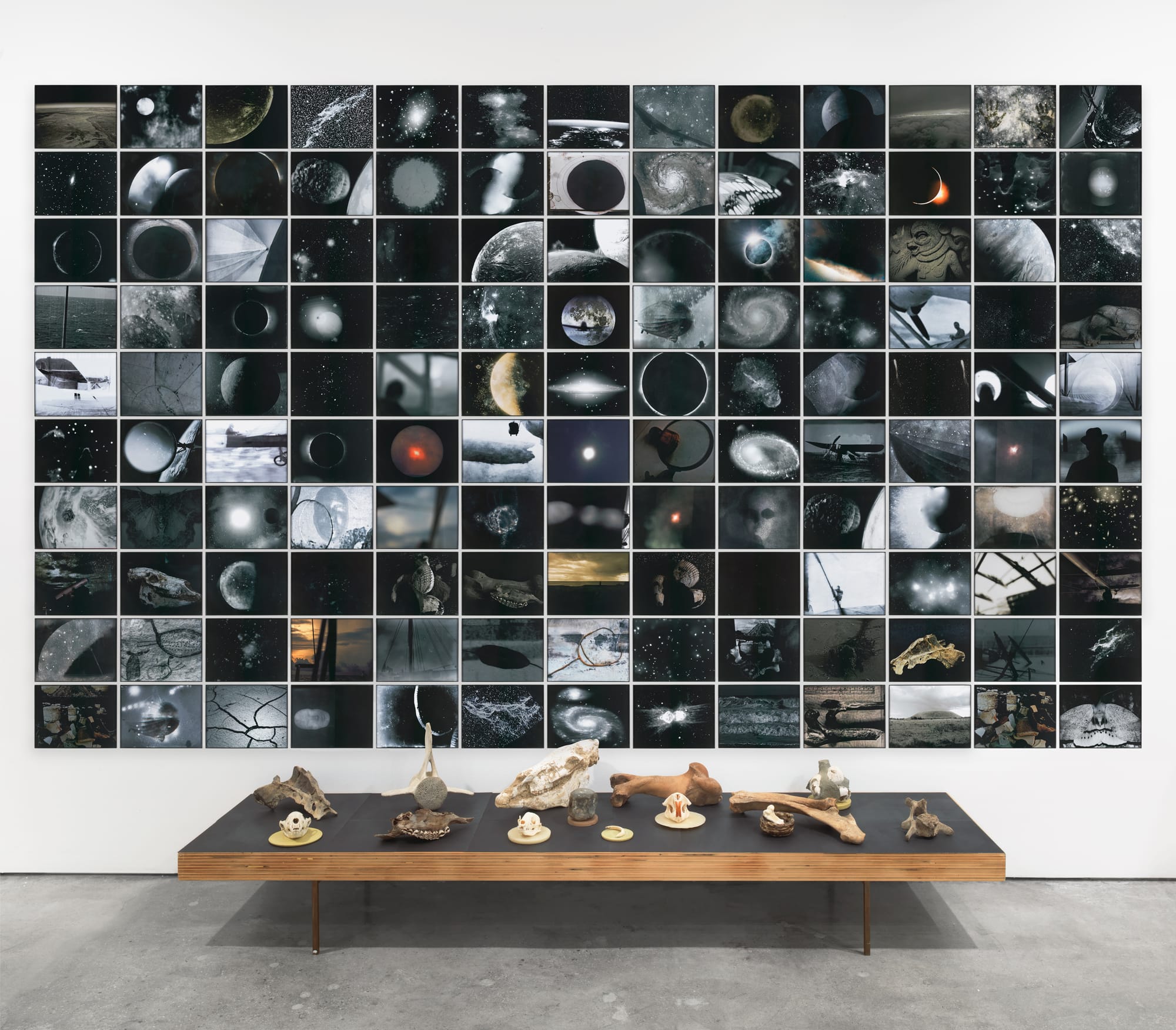 In the main space, hundreds of images line the walls in gridded arrays. The largest collection, These Fragments Against Time (2018), is composed of 130 photographs hanging above an altar-like table of bones, wax, and rocks. The images depict a dizzying constellation of celestial bodies, ancient ruins, biological specimens, and humankind’s attempts at flight — from early aircrafts to satellites orbiting Earth. Unlikely comparisons can be drawn between the different forms in the grid: for example, how the construction of an airship resembles the ridges on a clam shell, or how dusty moth wings unfold like giant nebulae in the sky. This presentation simultaneously resurrects ruins and bones and fossilizes our own technological path. In this grand scheme, with all patterns laid bare, human achievement seems both inconsequential and inevitable — more a byproduct of the universe’s immutable power than a reflection of our ingenuity.