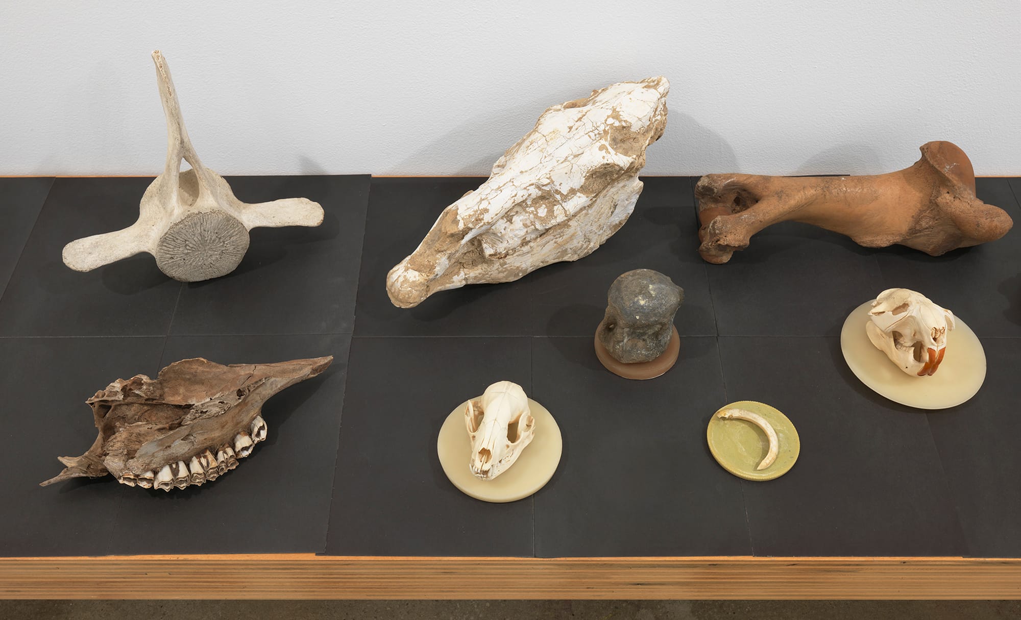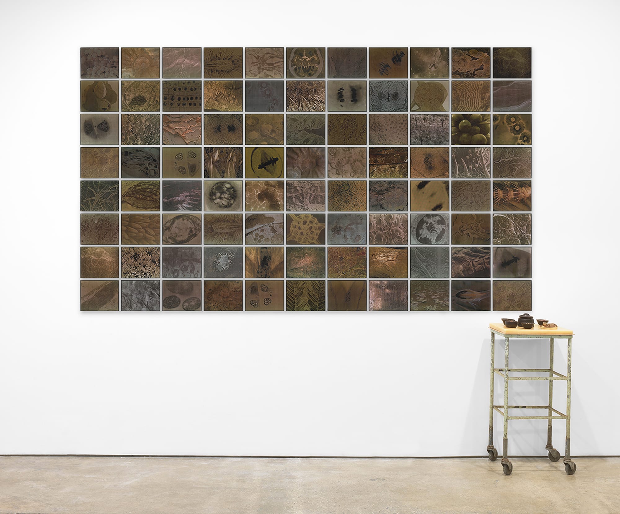 On an adjoining wall, the installation Trajectory of Evolutionary Correspondences (2009–10) explores certain patterns that exist at different scales in natural lifecycles on Earth. Here, the labyrinthine ridges of a cantaloupe’s skin mirror the radial spindles of cellular division observed through a microscope, and cross-sections of vertebrae resemble coiled genetic material. A side table holds piles of seeds and the skin of a toad. The physical substances gathered on tables beneath these photographs contains both the remains and the beginnings of life. Just as Stuart’s work on paper both removes and records the materials from a given site, these altars supplement the later photographic work with tangible traces of the sites and subjects surveyed.