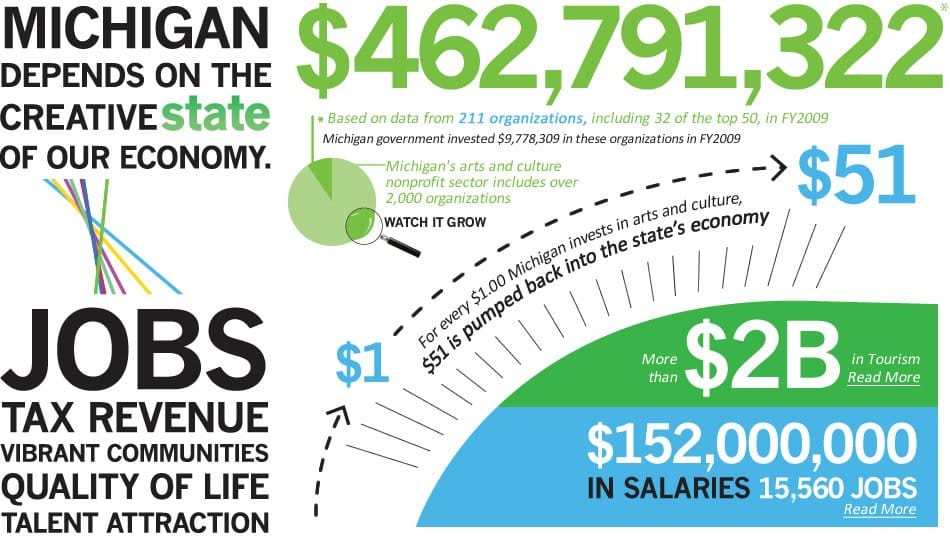 ArtsServe Michigan published the above infographic on Facebook and it shows why arts funding works. Every dollar invested into the state’s arts economy yields an incredible return.