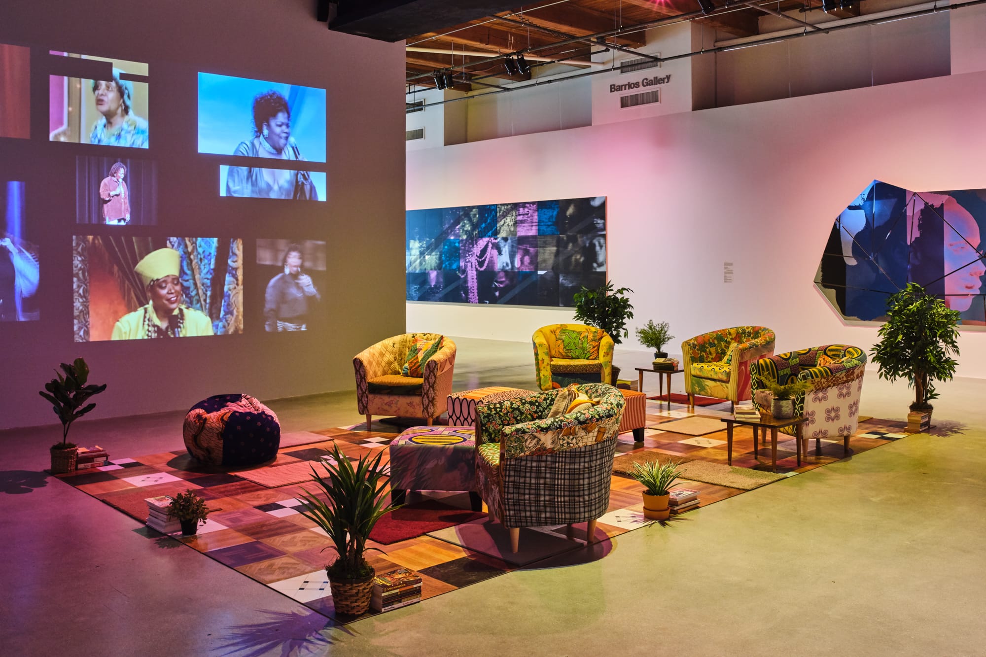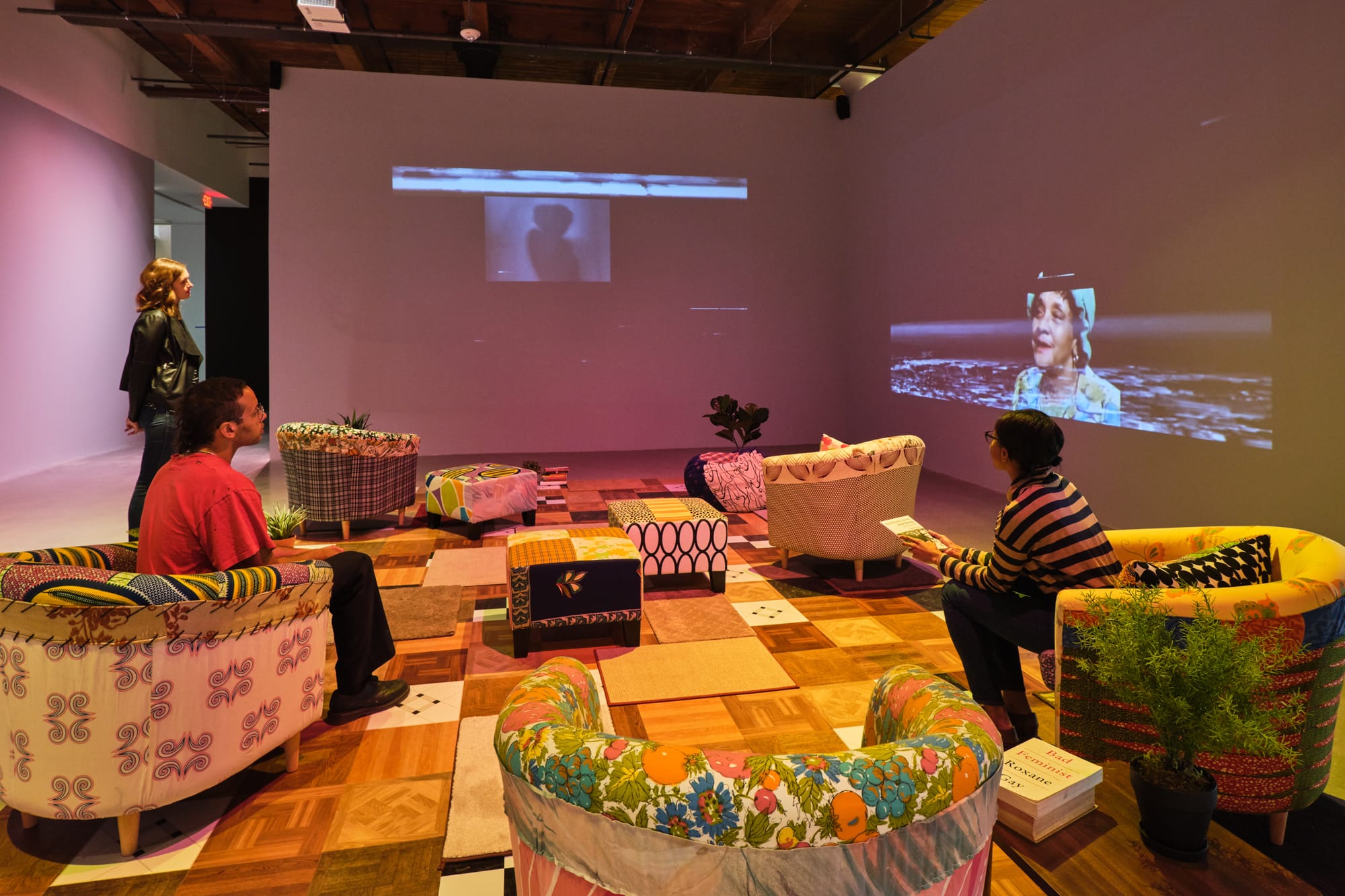 Projected on the walls around the seating area is Thomas’s 12-min 2-channel video “Do I Look Like a Lady? (Comedians and Singers)” (2016), which layers together clips of Black female performers including Wanda Sykes, Tina Turner, and Nina Simone. Several clips are projected simultaneously, creating a sort of Jeopardy-style grid on two perpendicular walls. Visitors can lean back in the comfy chairs and leisurely spend time with the range of women inhabiting this space. As Thomas explained of this film series in a 2016 interview, “together the thread of the music and the jokes tell this story of being a black woman. It’s sort of like, who is a black woman? What is a black woman?”