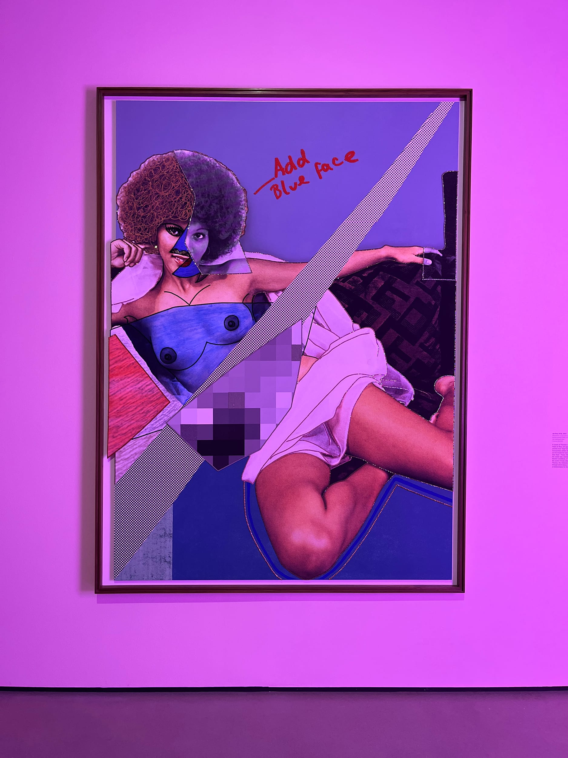 Rooted in collage, the works refract, layer, and interrupt themselves, transitioning from black and white imagery to saturated acrylics and enamels to rhinestone tracings to photographic prints. The abrupt shifts in these glittering surfaces seem to ask viewers to consider all that lies beneath — the self-fashioning of her subjects (most of whom she has depicted multiple times over the years), the formation and deconstruction of Black American aesthetics, quotidian acts of resistance shaped by a refusal to assimilate to White culture, the recent surge in interest in Black figuration and portraiture, and the reframing of art historical subjects.