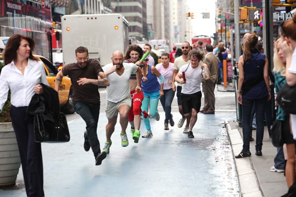 I ran to Times Square yesterday morning to catch a glimpse of artist Zefrey Throwell’s latest incarnation of his performance series, Midtown Games, but a missed subway connection which delayed my arrival a few minutes making me late to witness the artistic/athletic spectacle.