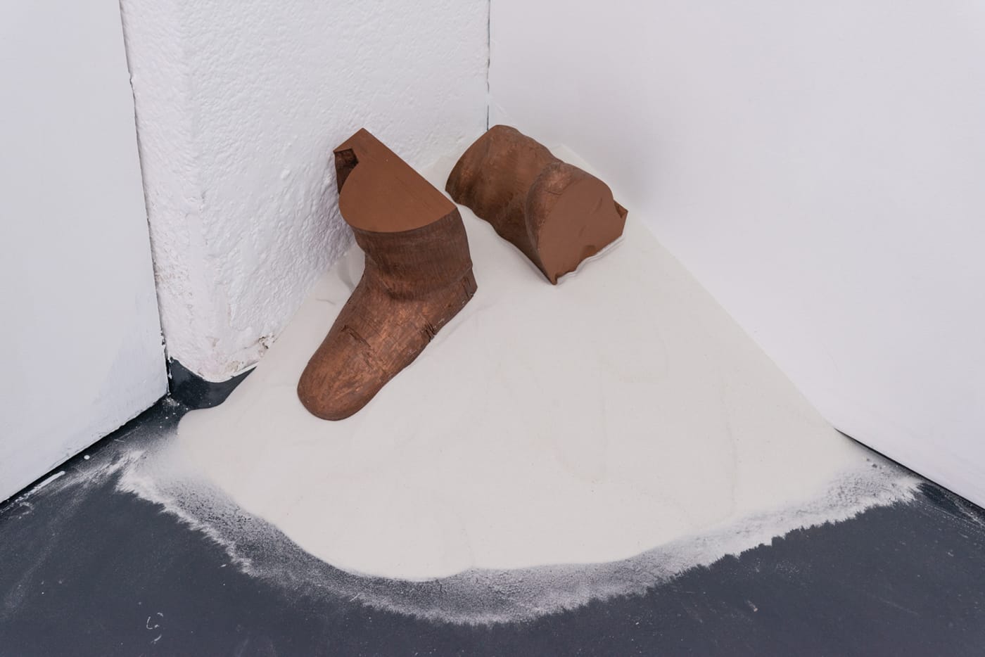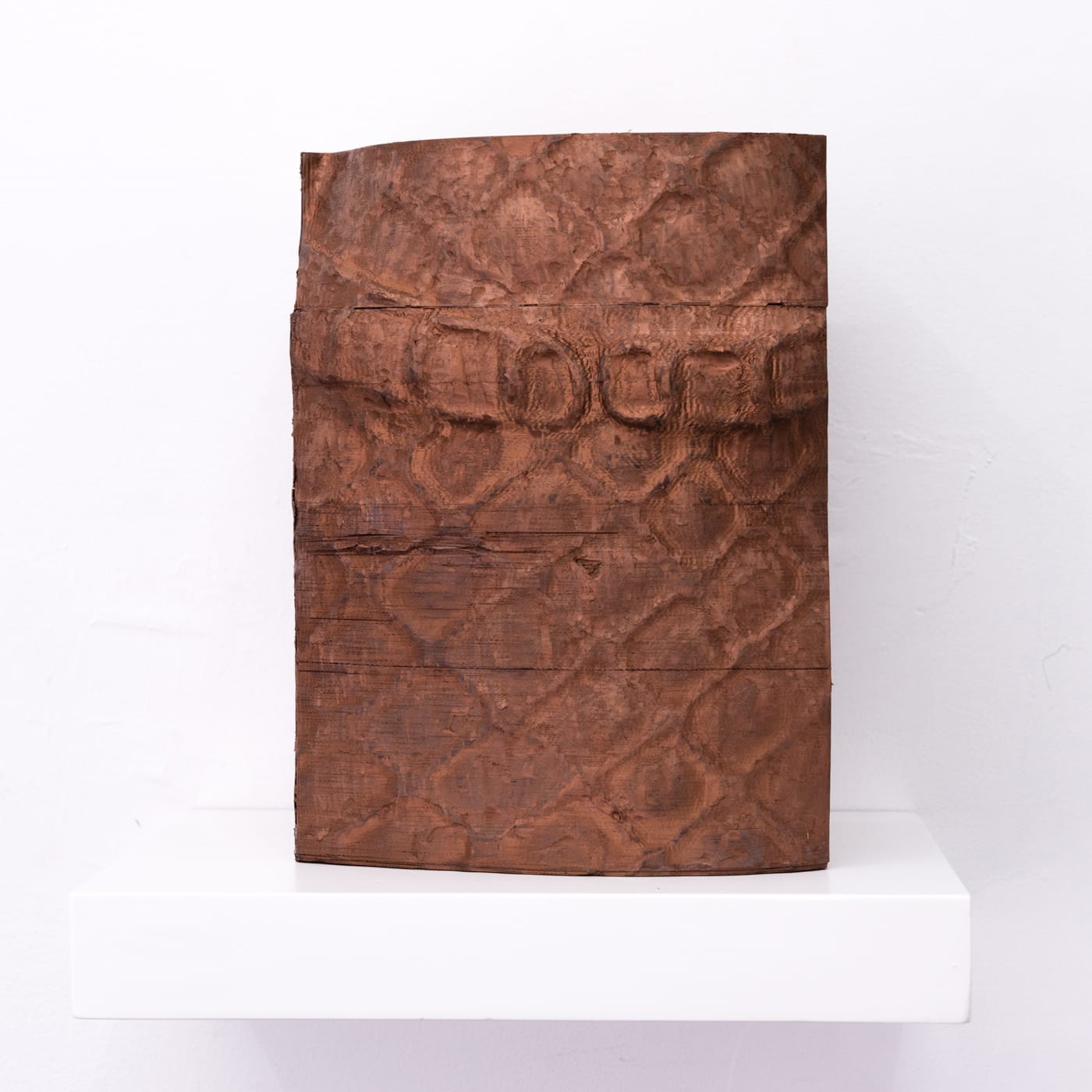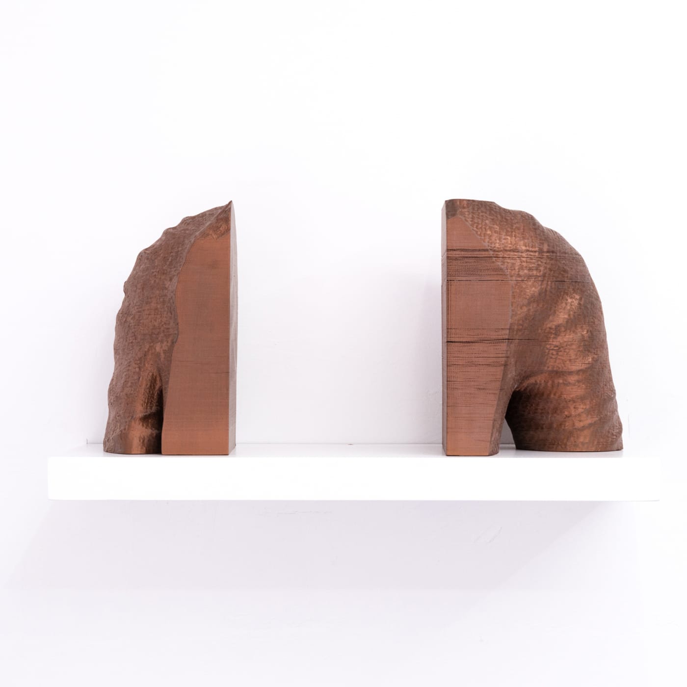 Salazar didn’t just appropriate Morehshin’s digitally rendered recreation, instead he used the computer to break the cenotaph into segments and displayed it like an artifact that had been uncovered already in pieces. There’s a head, a foot and a hand displayed separately, creating a new narrative about the destruction of the monument. Unlike the crude breaks that occur with the original sculpture forcefully toppled over by bearded ISIS fighters, Salzar’s fragments, made from copperFill — copper material for 3D printing — are cleanly separated into squared off sections. The square, printed fragments seem somehow pixelated even though they’re three dimensional.