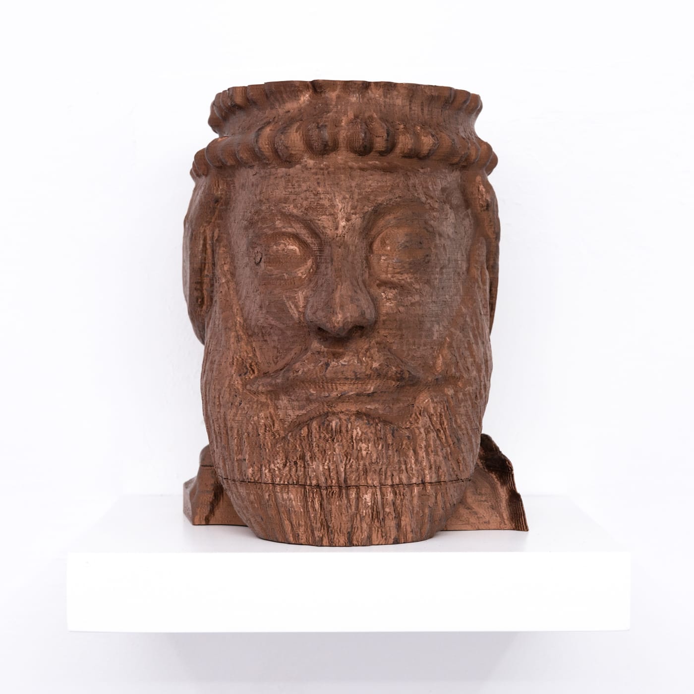 But rather than simply lament the attempted destruction of culture, the digitized cenotaph celebrates reinvention. However, something is lost in the digital recreation of original artifacts, and that may be why we value the original over the copy. Prologue Digital Cenotaphs points out the degradation of information through reproduction. The reproductions in the gallery space at Galeria Mascota reveal details lost in the 3D printing process and imperfections in the digital file sourced from the last known images of King Uthal’s effigy. Like it is with war, sometimes the damage done is permanent and sometimes what’s lost cannot be recovered.