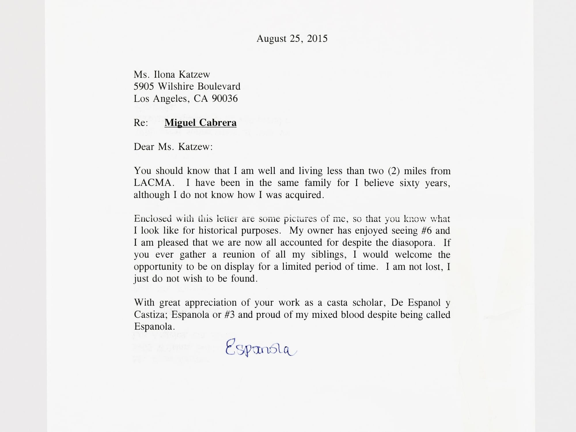 “You should know that I am well and living less than two (2) miles from LACMA,” “Española” wrote, late in the summer of 2015. “I have been in the same family for I believe 60 years, although I do not know how I was acquired.”