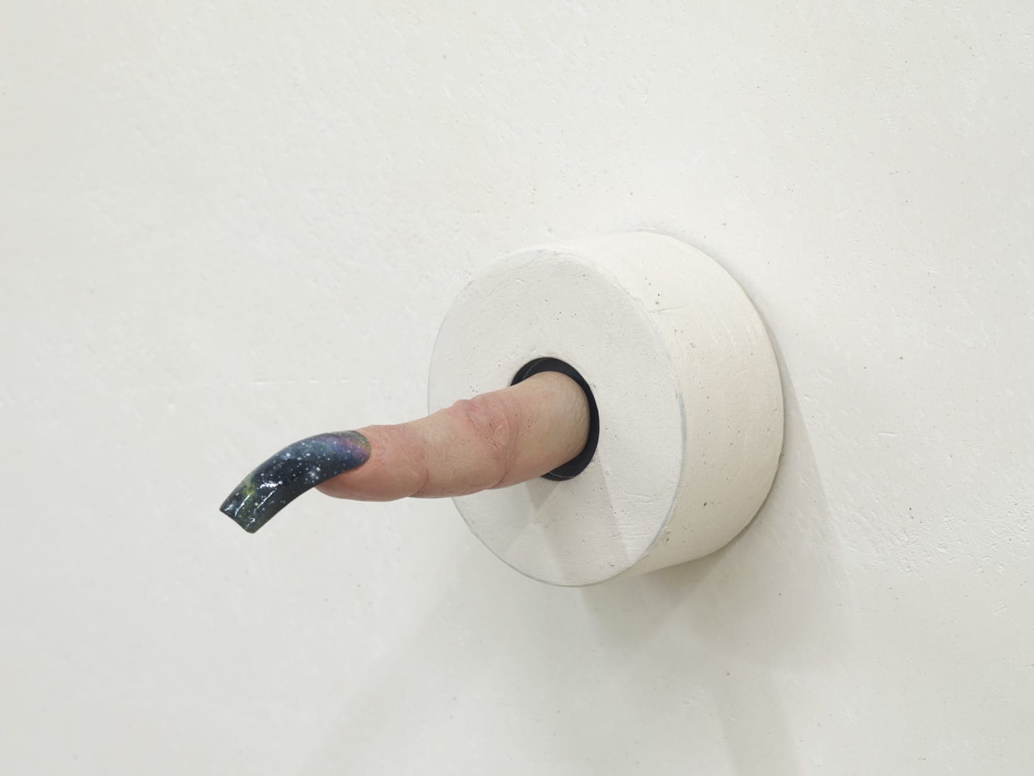 Rottenberg often finds her non-actors online and insists on paying them the same wage that they would typically make for their services. Like in their normal professional lives, under Rottenberg’s camera they enter into a form of self-commodification in which we, as viewers and voyeurs, also become uncomfortably complicit. Body parts, in Rottenberg’s dystopian oeuvre, are as much commercial products as the gold plastic nodding toys in her video “Cosmic Generator.” The exhibition is filled with strangely-placed disembodied limbs. In one room, a finger with a comically long, manicured fingernail emerges from the wall. In another, a vigorously bouncing auburn ponytail.