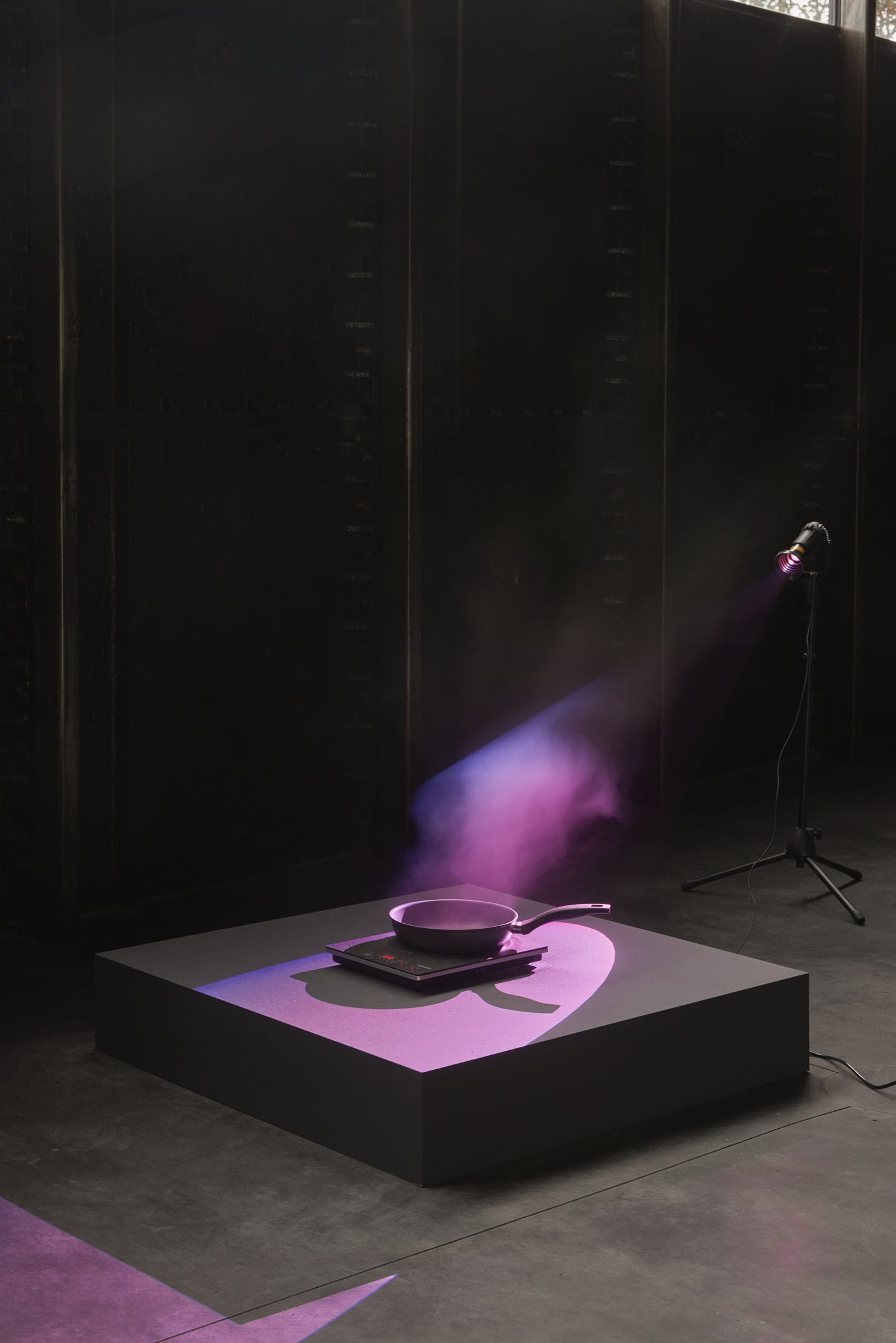 Apart from the recurring motifs — fake nails, bulbous noses, and aggressive (albeit productive) sneezes — there are humorous echoes between the videos and installations. A drip from a rotting ceiling, which periodically rouses a slumberous bingo-player in the video “Bowls Balls Souls Holes,” reappears in two of the exhibition’s installations. In one, an old-fashioned air conditioning unit waters a potted plant beneath it, and in the other, drops of water periodically descend from the ceiling, causing a group of heated frying pans to sizzle. The fact that the Goldsmiths CCA, recently converted from a Victorian bathing-house, still has the occasional leak and industrial smell, means that it is the perfect setting for Rottenberg’s immersive work.