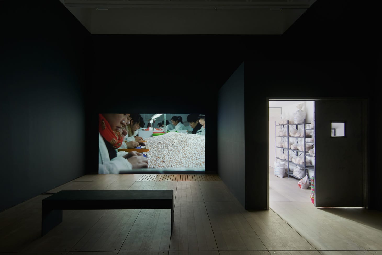 Though the characters inhabit specific locales — a Chinese restaurant on the Mexico-US border, a wholesale market in Yiwu, China — there is very little sense of place or time. Yet, true to a globalized world, the indeterminate settings are always interconnected. In the video “NoNoseKnows,” a worker in a pearl factory in China pedals a wheel, which powers a fan that blows pollen into the nose of a hayfeverish woman in a cell-like office in some part of America. As her nose extends à la Pinocchio, she sneezes out an assortment of noodle-based TV dinners which, we can assume, may be used to feed the Chinese pearl factory workers. Much like the bicycle pedals (which appear in several of Rottenberg’s works), all of the videos and installations operate on an endless loop: this is shift work with no end-of-shift.