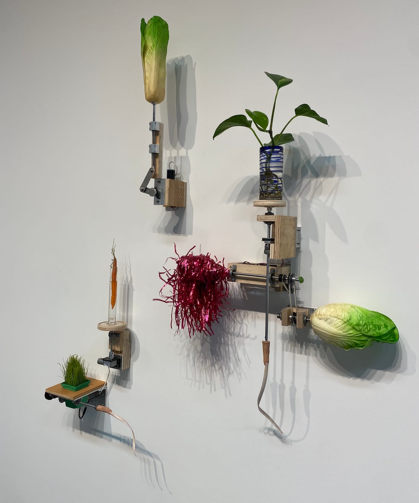 Rottenberg further explores this tension inherent in a globalism that isolates even as it connects in the show's physical works, such as her fingerprint drawings, brightly colored indexical marks that assemble into microbe-like colonies, or serve as the basis for drawings of body parts. Rube Goldberg-esque kinetic machines spin plants and produce (real and fake) ponytails of hair or fake nails on fake fingers in absurd, pointless, but momentarily fun displays. Visitors are invited to turn the crank on a couple of these, heightening the illusion of agency in a system where productivity is valued above all else.