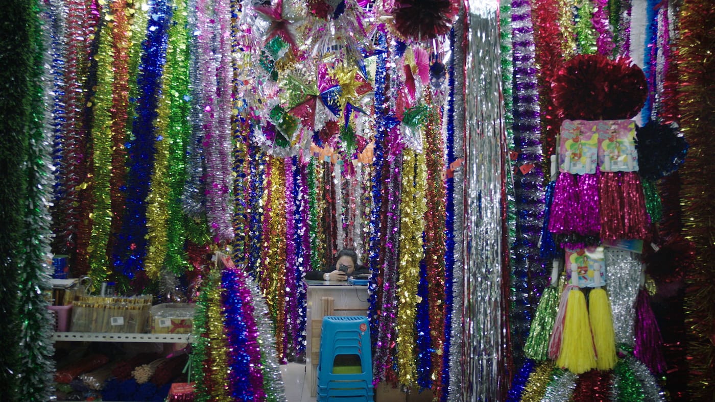 “Cosmic Generator (Loaded #3)” (2017–18) offers perhaps the best introduction to Rottenberg’s oeuvre. Filmed on-site at a market for plastic goods in Yiwu, China, and Mexicali’s Chinatown, in Mexico, the video mixes scenes of these real sites with elements of magical realism shot in a studio. Slow pans over vendors sitting in their booths full of cheap, glittering, rainbow wares are juxtaposed with Chinese restaurants in the Mexican border city, where miniature besuited corporate clones wriggle on beds of cilantro.