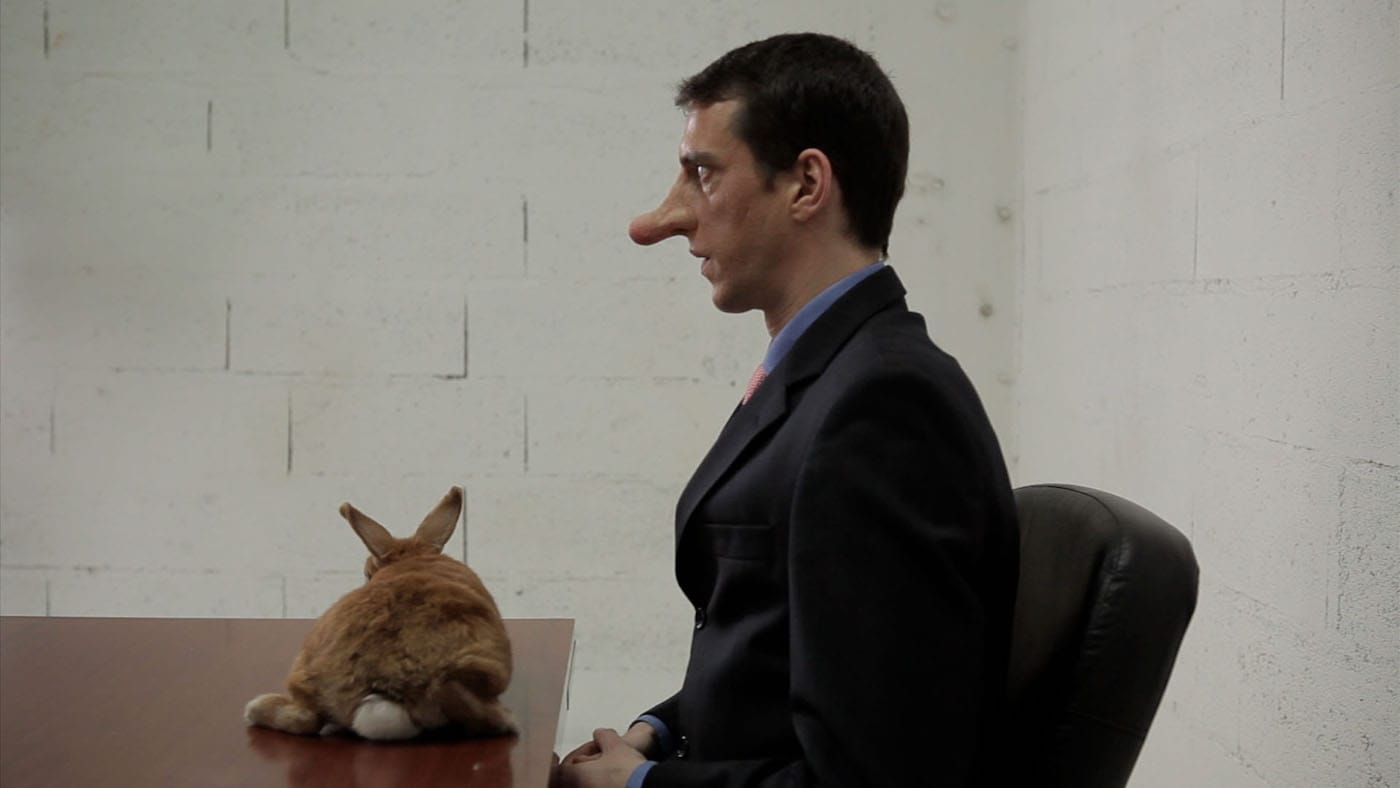 “NoNoseKnows (50 Kilos Variant)” (2015) was filmed at a pearl farm in Zhuji, China, where workers at long tables delicately insert foreign cells into oysters to create cultured pearls. One of the workers turns a hand crank that operates a fan on the floor above, blowing pollen into the nose of a blond woman; her sneezes result in various dishes of pasta that pile up on her desk as her nose grows à la Pinocchio.