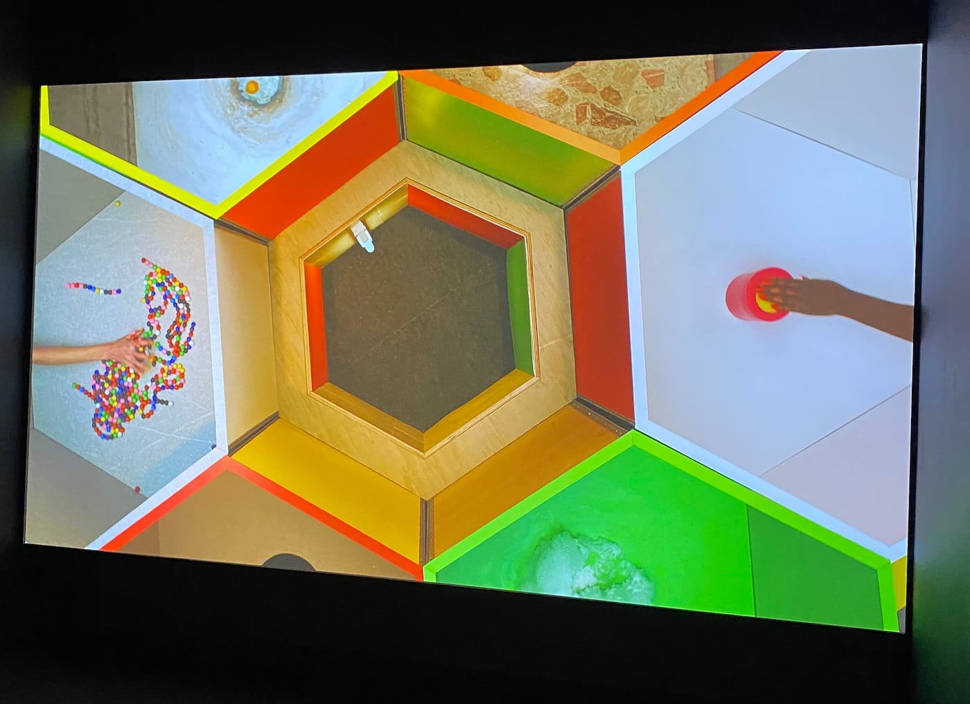 Rottenberg's fascination with this ASMR type of auditory activation is evident in “Spaghetti Blockchain” (2019), which features such enticing sounds as a jelly roll being sliced, dry pasta crunching, a rumbling harvester gathering potatoes, and hands squishing green goo, as well as the mesmerizing sounds of Tuvan female throat singers from the group Tyva Kyzy, who were filmed remotely in Siberia after the artist met them in Brooklyn. “Voice turns into a material, almost becomes a shape,” Rottenberg said at her talk with McCarthy and Ellegood, describing the singers. The disparate sounds are depicted in various chambers of a clicking, hexagonal machine, which offers up each new vignette as it rotates, collapsing real distance through its clockwork mechanism.
