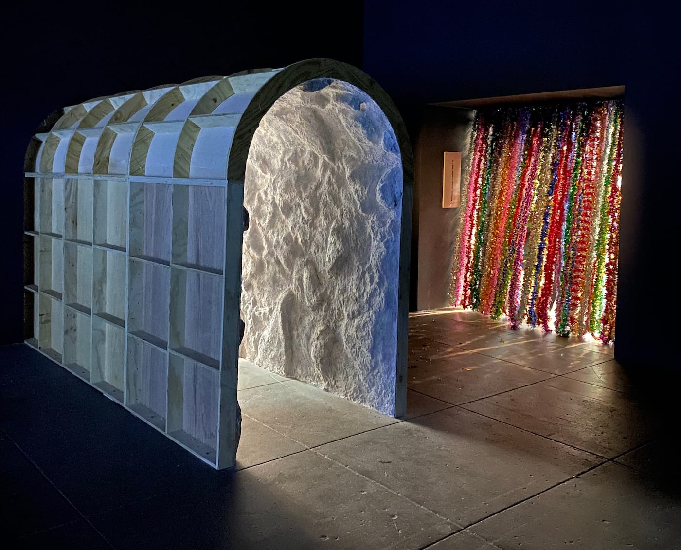 A tracking shot reveals a tunnel (of the kind dug under the actual United States border by smugglers) that magically connects the two locations on opposite sides of the world — an analogue version of the digital networks that move capital around the world at the touch of a button, even as people’s movements are curtailed by physical borders. The distinction between fantasy architecture and real space is further blurred by a fabricated tunnel, through which viewers enter the space, and a curtain of colored tinsel through which they exit.