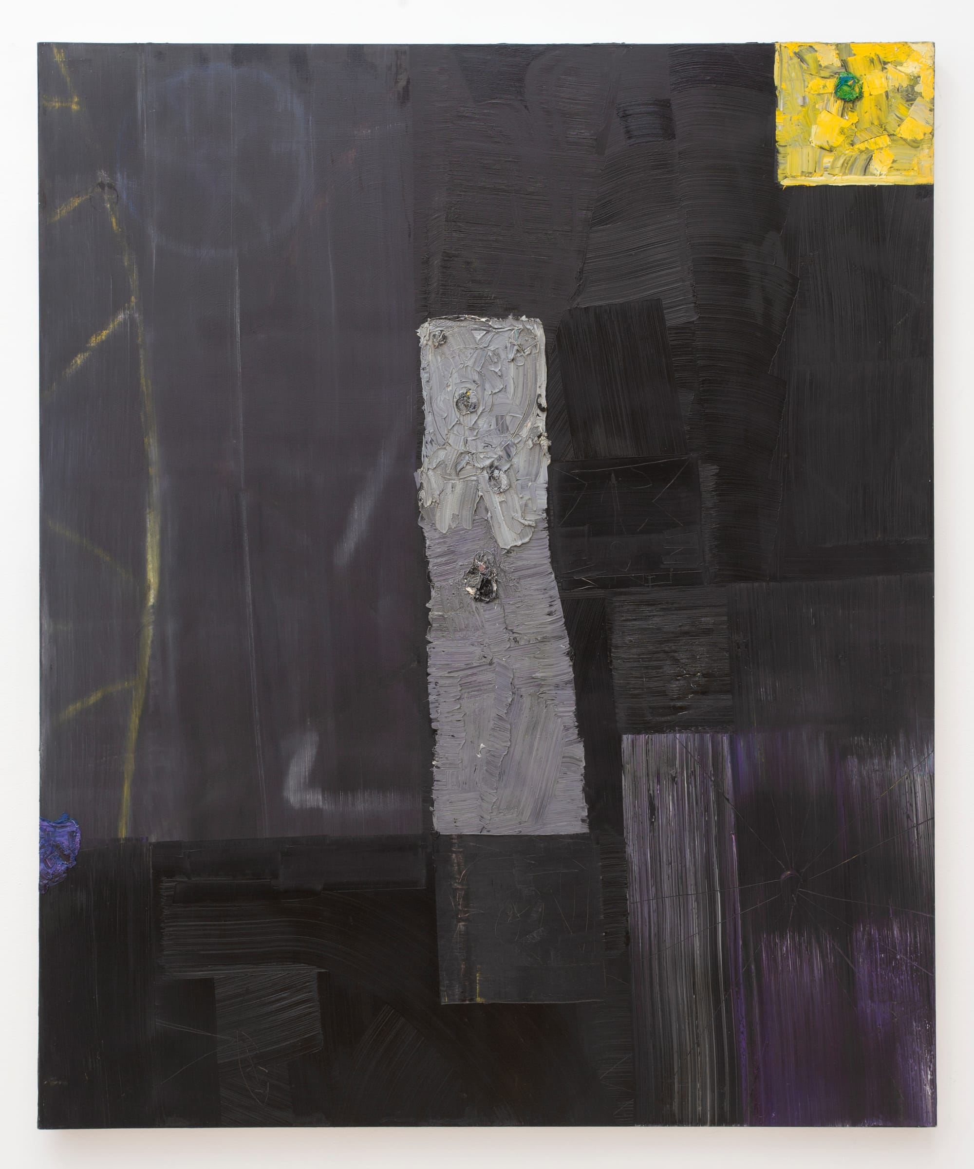 The paintings at Haines Gallery, dating from the 1990s to the present, are mostly black and gray, punctuated with bursts of bright color. In “Culture, Time, Sound” (1994), for example, a light gray obelisk lies at the center of a field of densely painted black and dark gray, with a vivid yellow square in the upper-right corner.