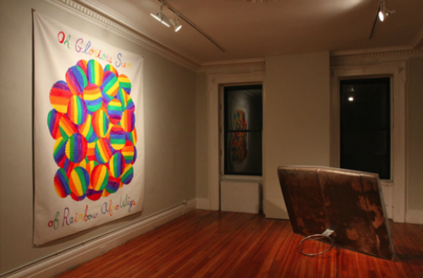 The exhibition ranges across mediums, weaving together work by both artists in and out of a dialogue marked by sculpture, installation, large scale drawing, painting and photography. Richard Prince’s large, welded metal basketball backboard rests in the middle of the gallery’s main room. The piece is reminiscent more of a dislodged aircraft fuselage or a minimalist sculpture than proper sports paraphernalia. A large scale drawing by Kelley stares back across the open room. Glowing orbs of rainbow color cluster to form a giggling mass of abstraction. Multicolored script read “A glorious sum of rainbow afro wigs.” Kelley’s signature yarn and plush installations serve as a branded mark against the white walls and bare wood of the gallery.