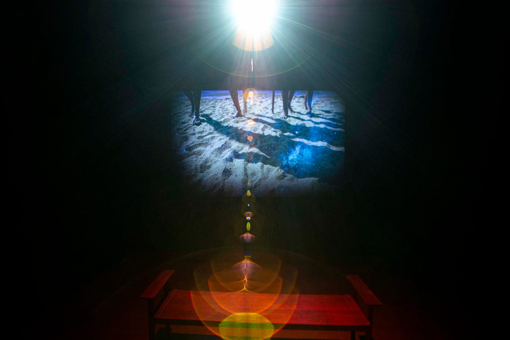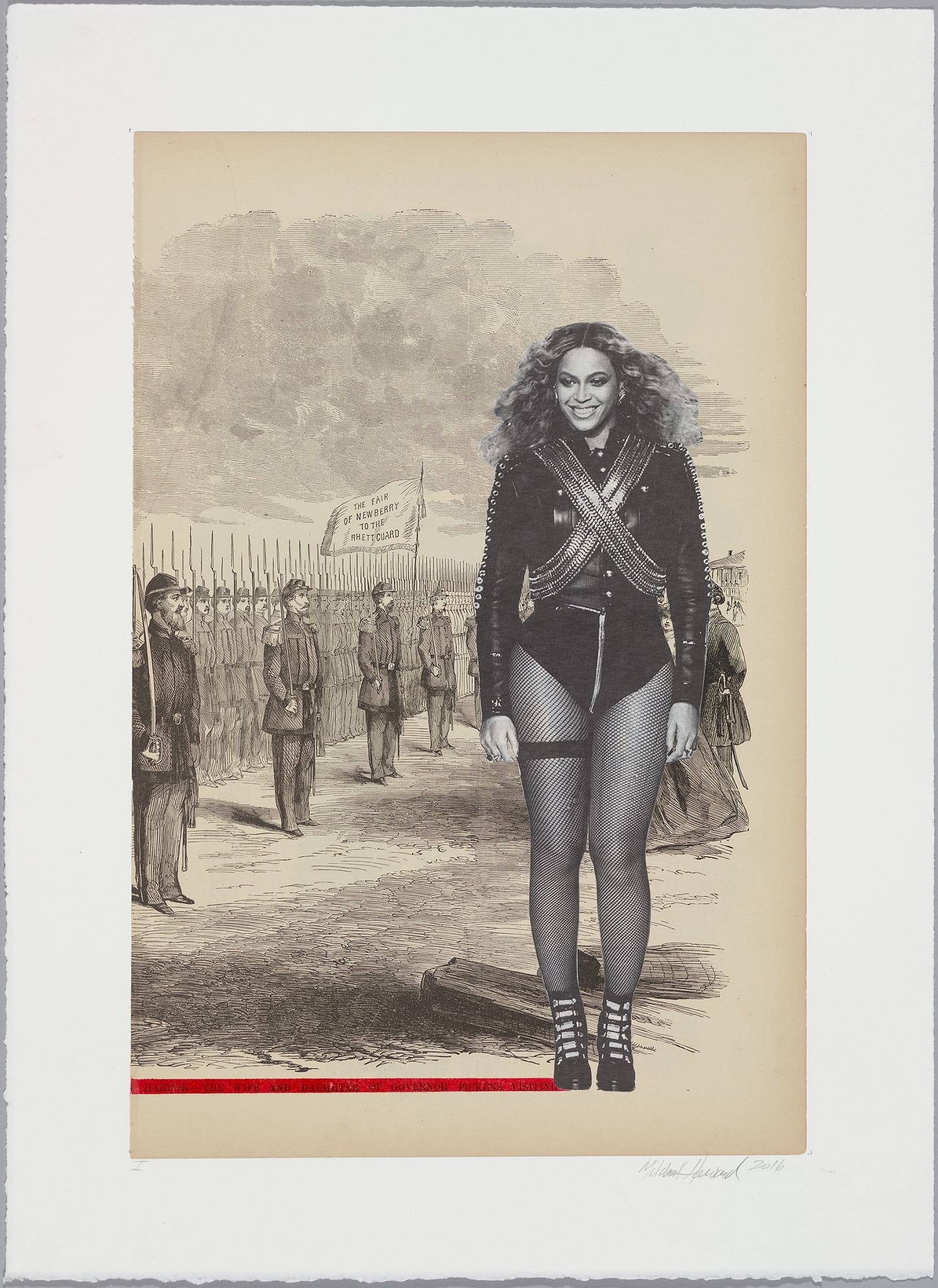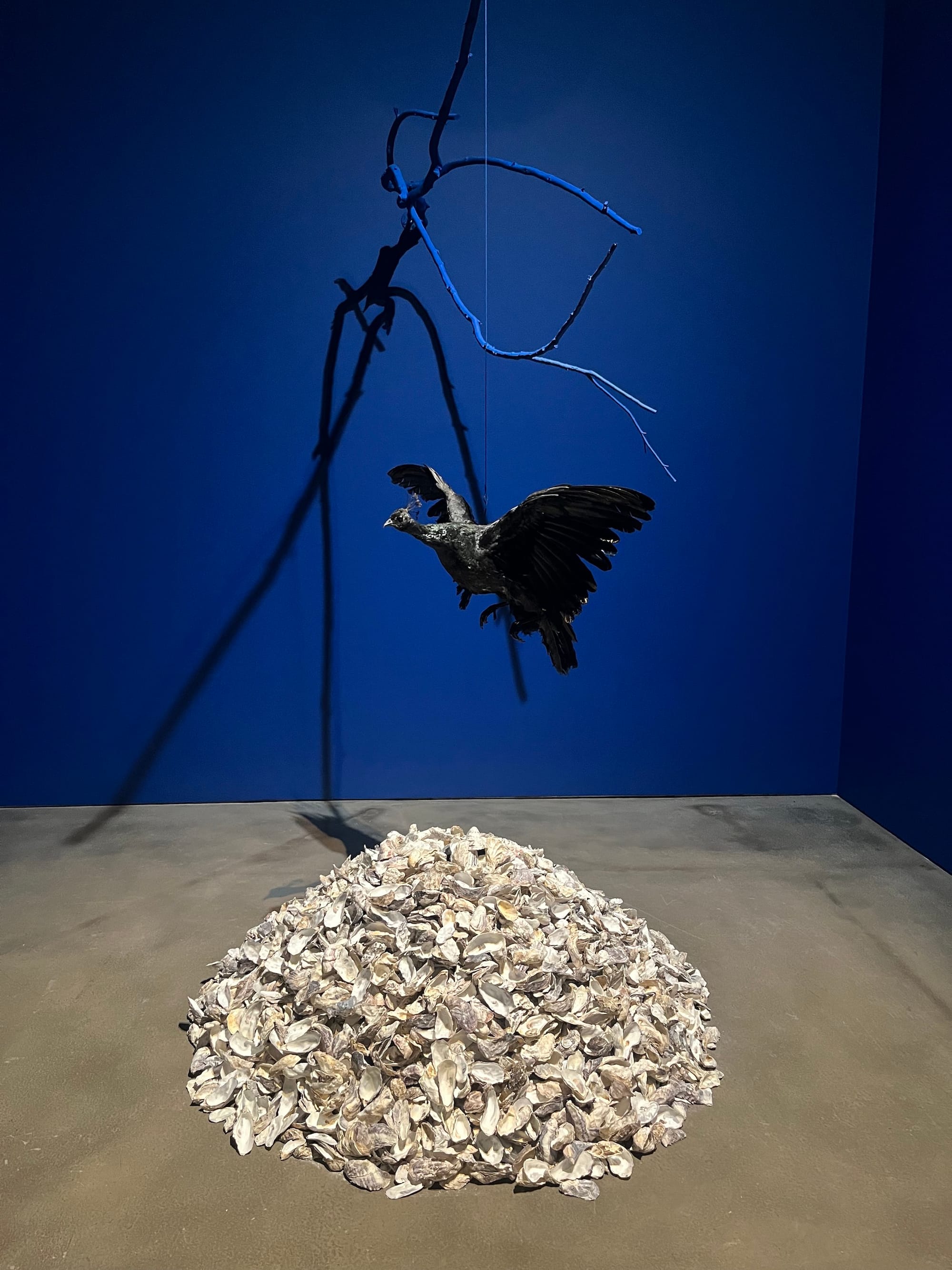 For her show at the ICA, Howard worked with composer Chris Brown to create music for each space and for a film that she made after discovering eight-millimeter film in her mother’s purse that Howard had shot in Texas when she was 14. In the galleries, a large black peahen flies over a pile of oyster shells; a clock is set to 6:19, representing June 19th — Juneteenth — commemorating the end of slavery in the United States; and a large funnel on the ceiling pours sand onto the floor. In another gallery, 30 of Howard’s prints hang on the walls.