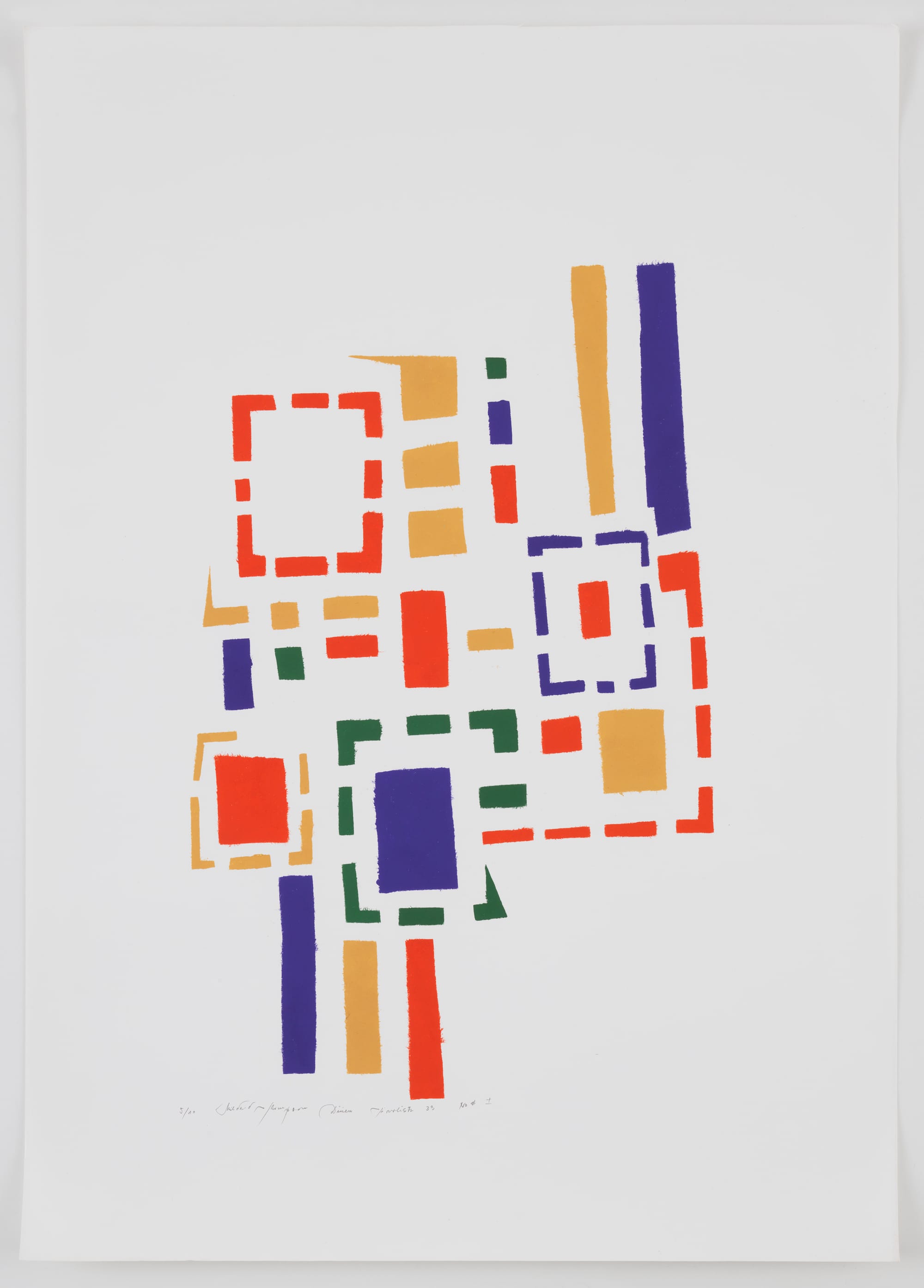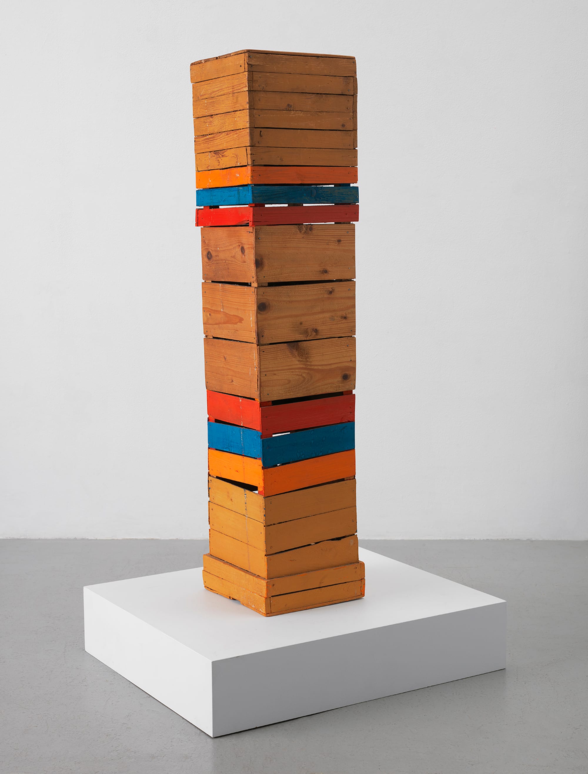 Spread across two galleries, Throughlines is connected by a spacious hallway with displays of colorful silkscreens, such as “Untitled (No #1)” (1973). The silkscreen works recall the grid-like spatial mapping of a city, with blocks, streets, and buildings abstracted into orange, yellow, green, and purple lines of varying widths and lengths. Varying textures, shades, and shapes abound in Thompson’s assemblages. Some Wood Pictures are hung eye-level on the wall like a painting, while others are free-standing vertical sculptures. “Stele” (c. 1963) stretches 3 feet tall and less than a foot wide, with splashes of pinkish red, cerulean blue, and neon orange that boldly stand out against the natural colors of the wood.