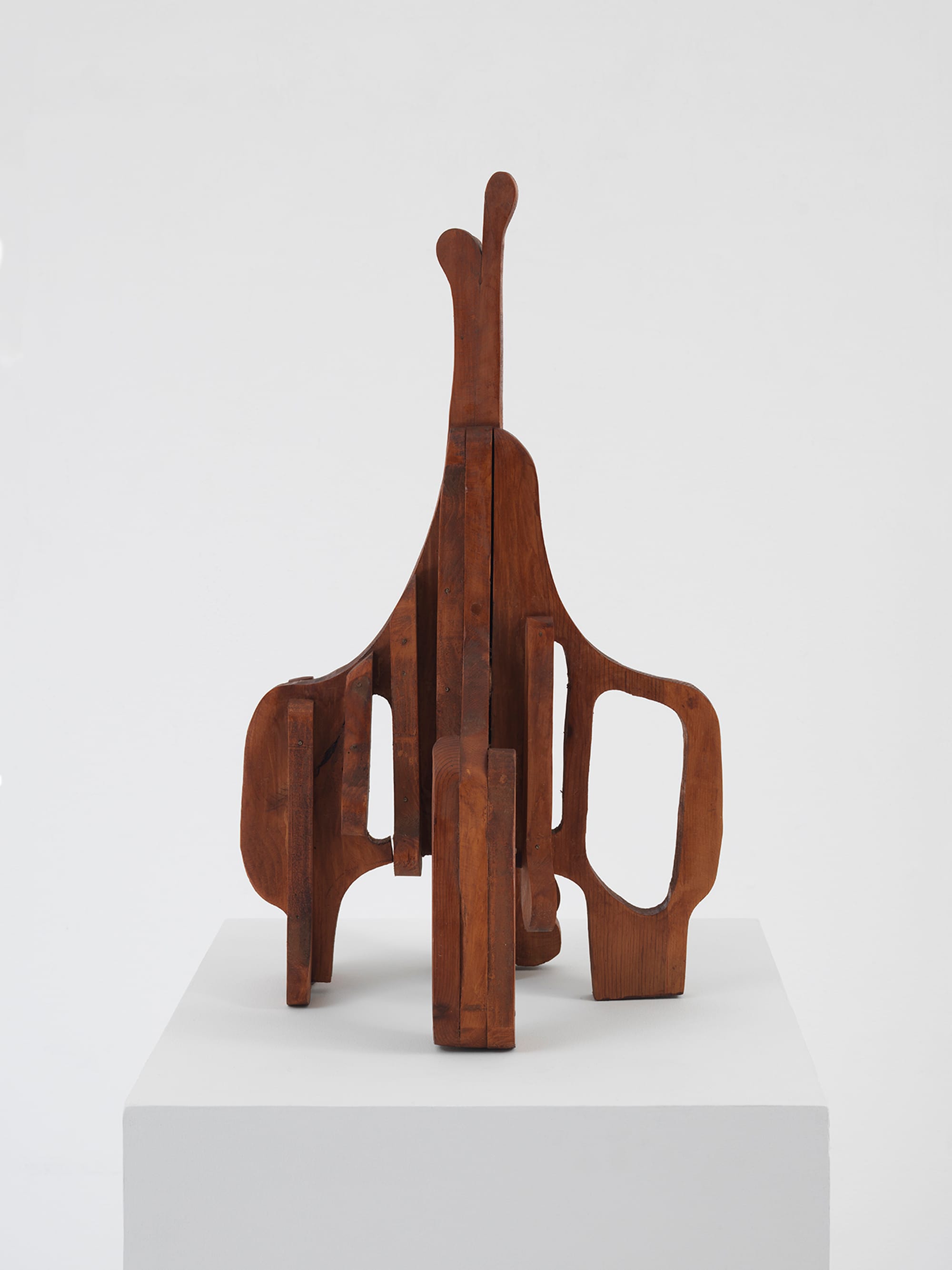 Thompson combined wood sourced from German forests with machine-cut wood segments, resulting in a tension between the naturally-occurring curvaceous lines in wood and those that were manufactured or painted. In merging visually different pieces of wood, she accentuated the asymmetry of the designs instead of imposing a strict grid-like format to create uniformity. Thompson was also a trained musician and instilled a sense of musicality throughout her works: some sculptures are shaped like abstracted musical instruments while others present a rhythmic flow through varied patterns.