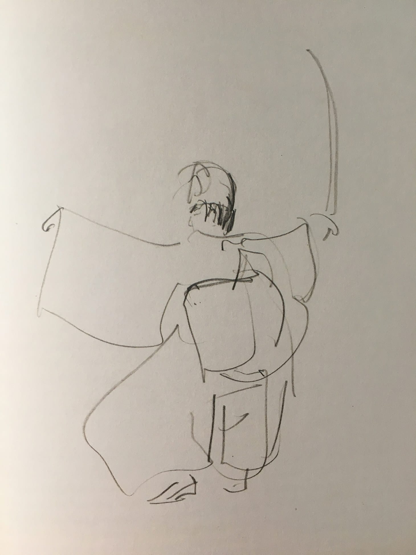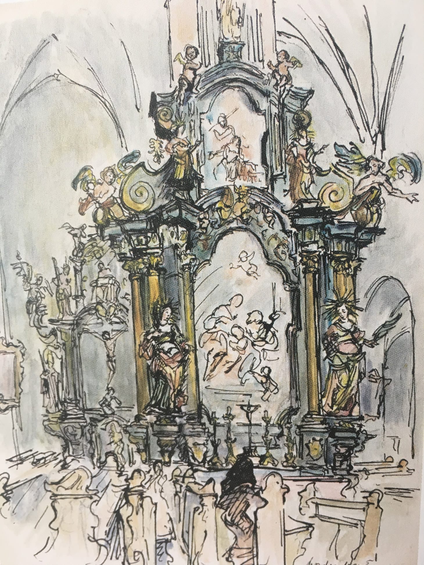 Cosman’s best drawings tend to be her most concise or her most frenetic. Her pithy drawings of dancers and conductors, which look as if they’re made up of one single line, capture all the energy and intensity of her subjects’ movement. On the other end of the spectrum are her sumptuous drawings of Central European cathedrals — explosions of thick Rococo curls and swirls.