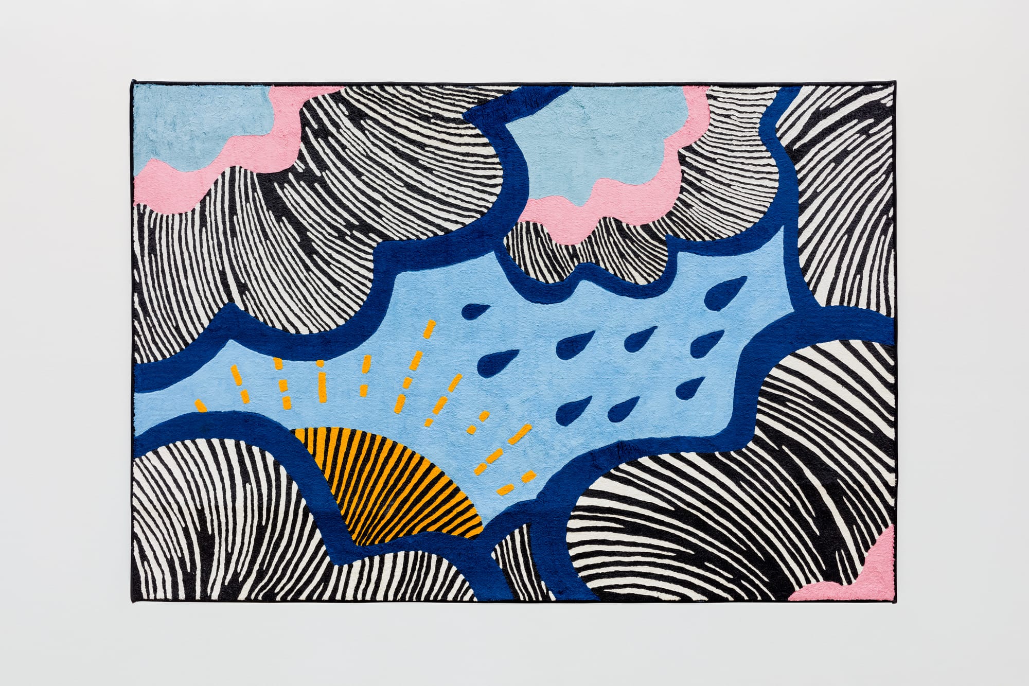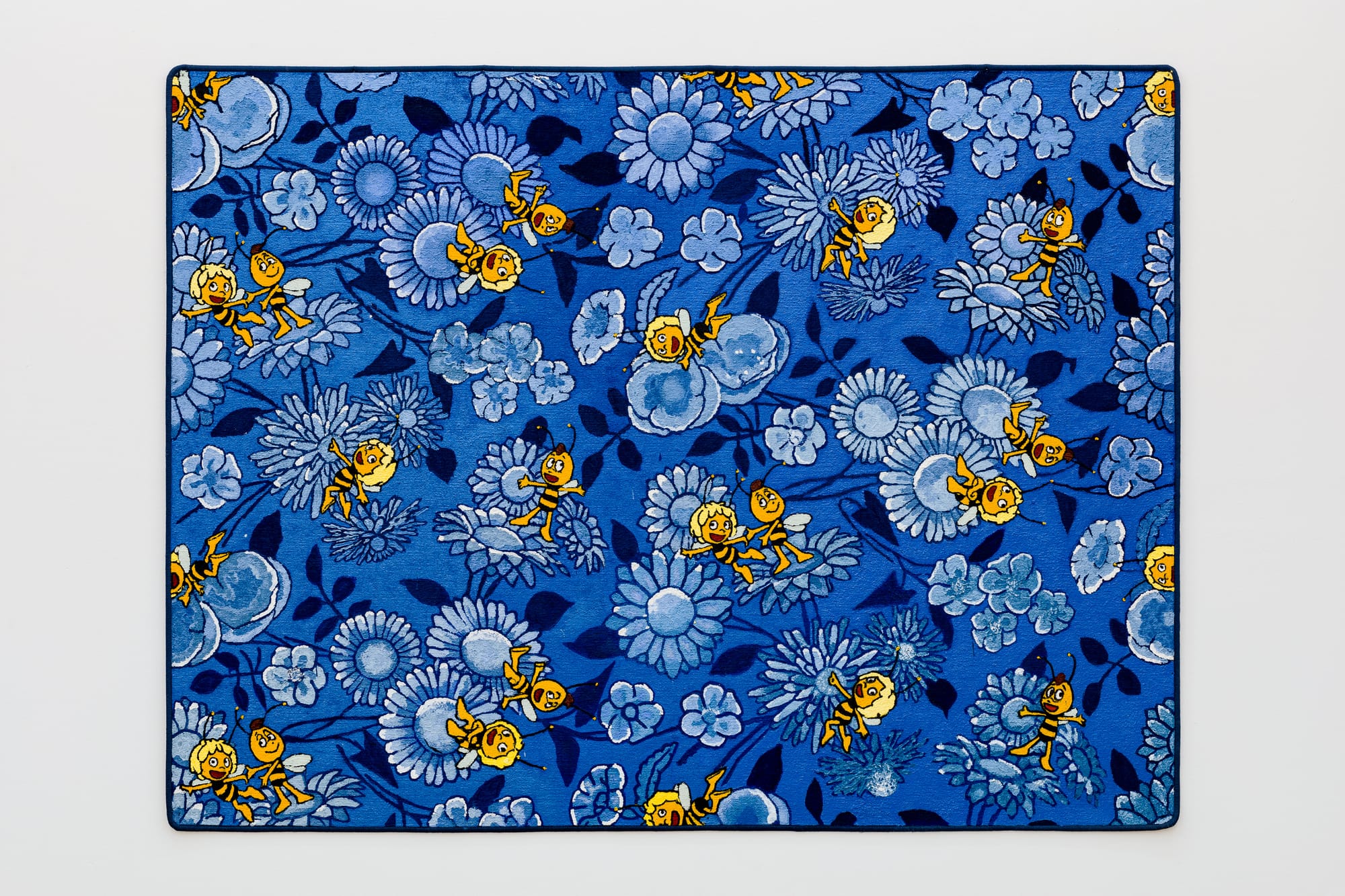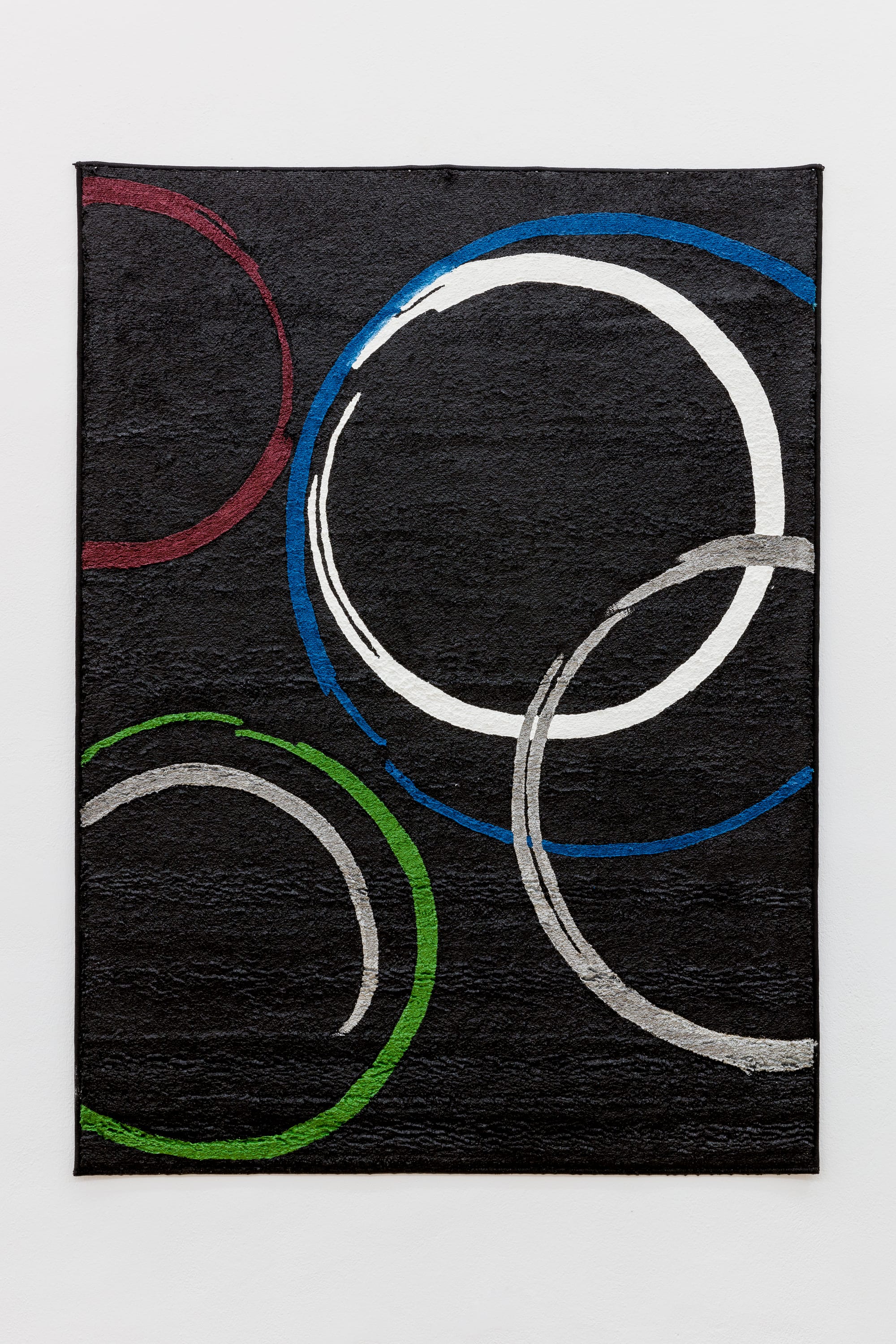Frankfurt-based Milena Büsch’s solo exhibition, Battle Royale consists of three huge (roughly four- to six-foot) oil paintings on carpet: “Biene Maja/Maya Blau” (2018) and “Teppich mit Kreismuster – Moda 1062 Schwarz” and “Doftranka” (both 2019). Büsch’s sparse installation and unorthodox materials are in keeping with the gallery’s previous exhibitions; the press release, likewise, reads only, “Battle banal.”