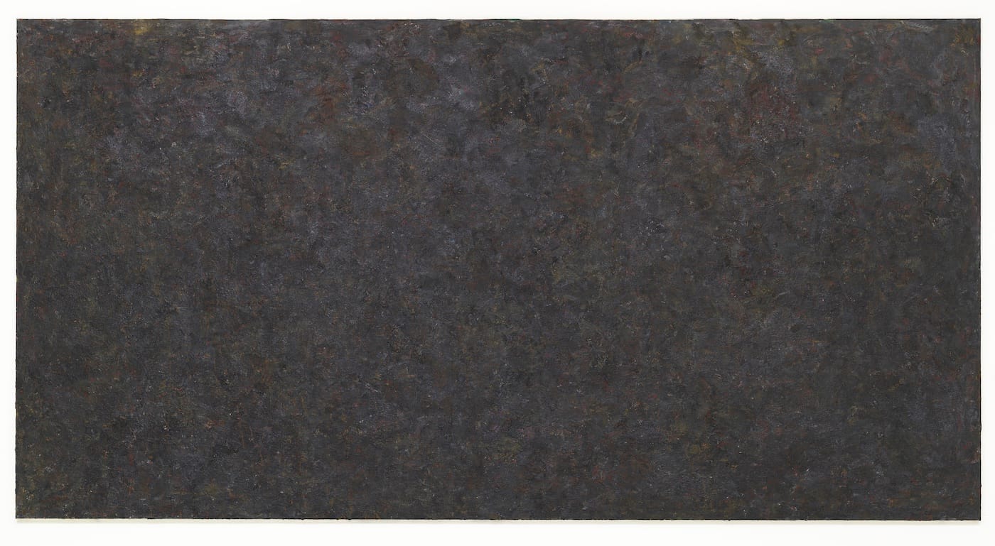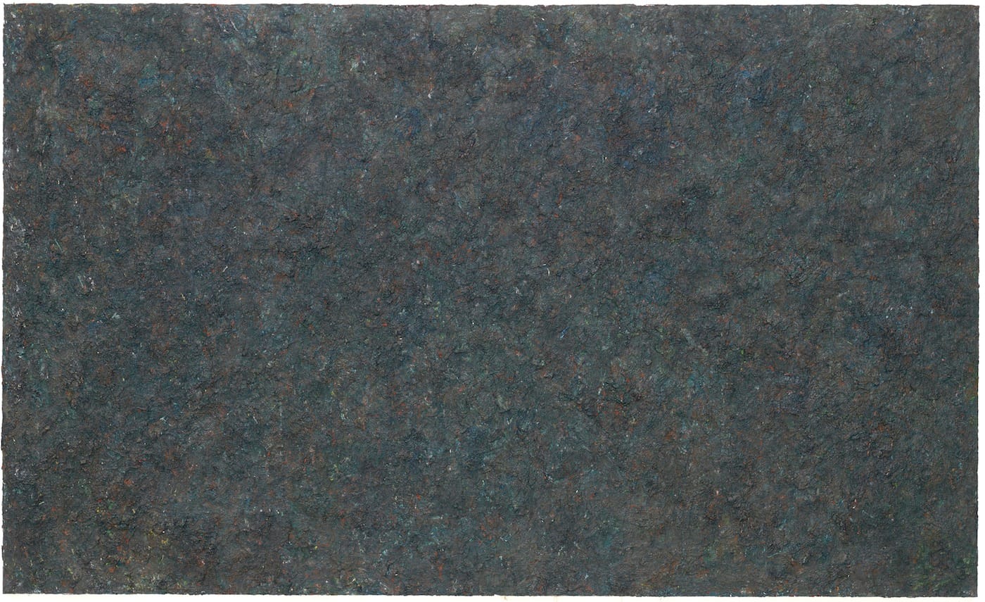 The somber, delicately grayed-out “Winter X” (1975, 90 x 80 inches) dates from that chapter in Resnick’s life; a few years later, the even more enormous paintings he was doing in the capacious Eldridge Street space, such as “Elephant” (1979, 109 x 210 inches) and “Veil of Isis” (1985, 75 x 124 inches), fully realize the weird potential of a procedure that obviates the need to step back and survey the work in progress. “Veil of Isis” is truly encrusted and seems to sag under the weight of a skin of paint the color of iron, mahogany, peat, and ashes; “Elephant” is similar (perhaps cooler) in coloration, its surface slightly translucent in places and, while also outrageously tactile, more open to the play of light across its surface.