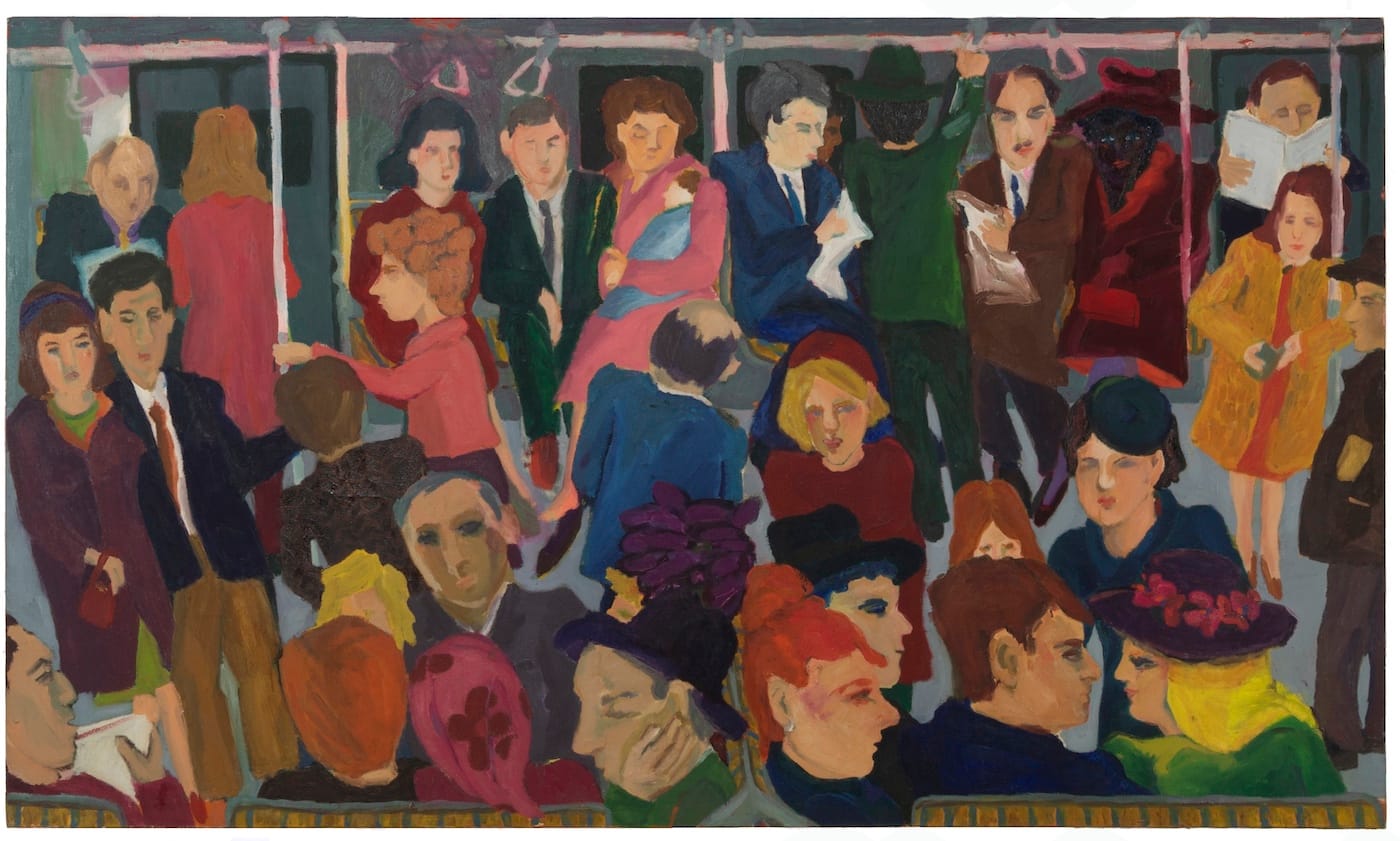 That is not all that Gross does in these masterful paintings, which she completed when she was in her early 20s. In “On the Subway,” she has vertically bisected the subway car’s horizontal rectangle and choreographed the space with color. The bisected middle consists of two vertical rows of figures, each on one side of the divide. At the bottom of the double-stacked rows, two heads are rendered in profile, facing in opposite directions. The man facing left wears a black hat, which connects diagonally to a similarly colored hat on a man on just the other side of the divide, sitting beside the woman facing in the opposite direction.