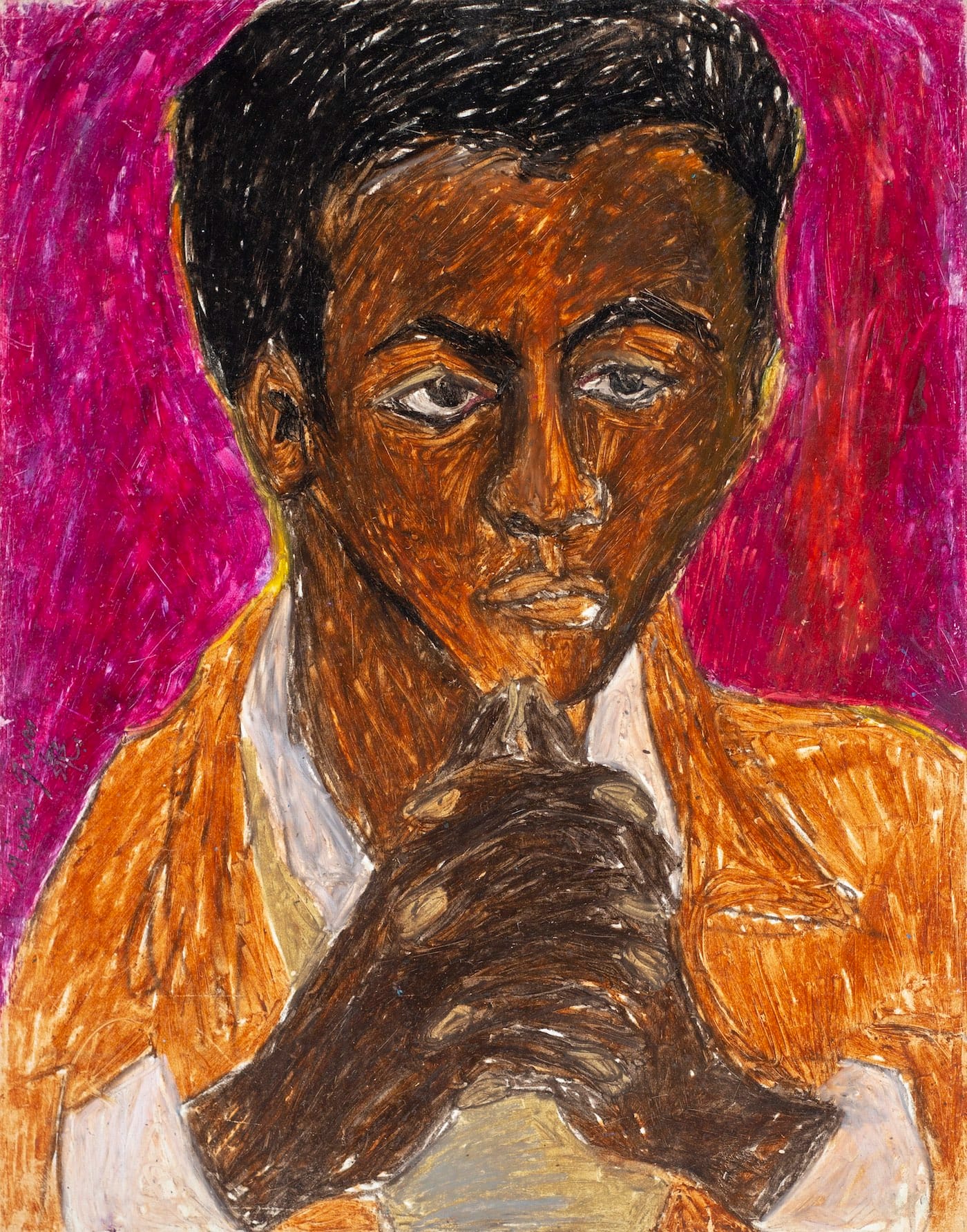 A good starting point is her portraiture, done mostly in oil crayon, where she strikes an individualized impression with each piece, often through her use of the background color. In “Henrietta” (1962–63), she employs a rose ground to play off the sitter’s orange hair, pink cheeks, red lipstick, and the two blues that make up her dress, while a maroon ground is used in her depiction of the artist Bob Thompson to frame his dark brown skin, his darker brown hands, black hair, and umber shirt. So much feeling comes through these and the other portraits. It is obvious that the same painter also did “Joan” (1958–59) and “Red” (1962-63), but each one is sufficiently different in color relationships and pose to convey its own mood.