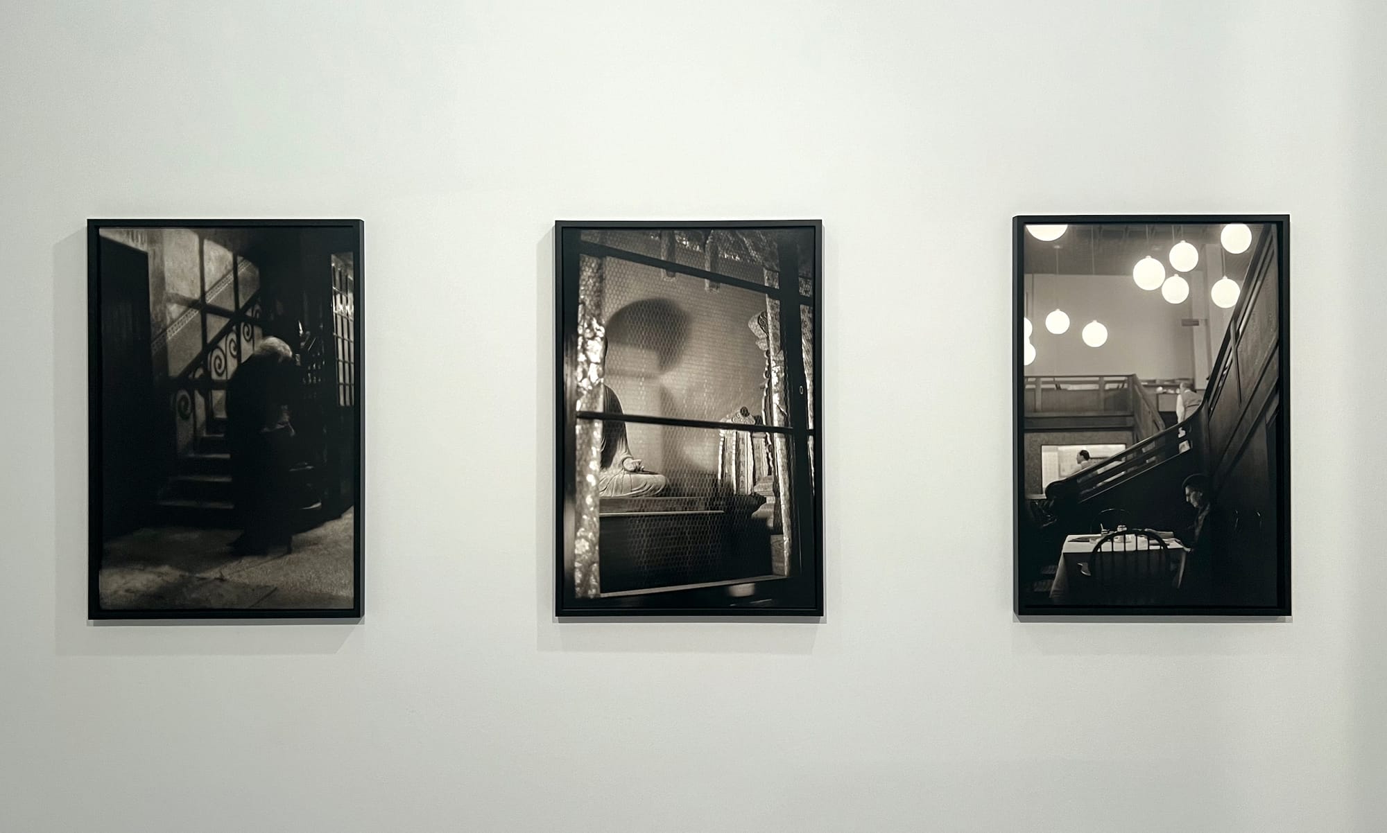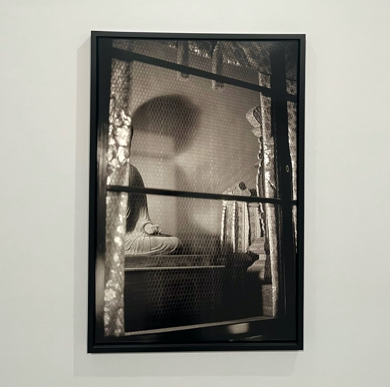 Look, for example, at the dark, discordant atmosphere in a photograph aptly titled “Shadow People” (1991). On the left side, we glimpse a small sliver of Buddha sculpture — a hand, a knee, and folds of a stone robe. Behind him on the wall, the huge penumbra of his body stretches tall and wide, its uncanny mass looming over the visual field. The sculpture is protected by a metal screen, whose delicate lattice pattern catches shards of light and contributes an additional layer of obfuscation and concealment. Cast into this enigma, the eye takes a few moments to adjust to this play of visual timbres.