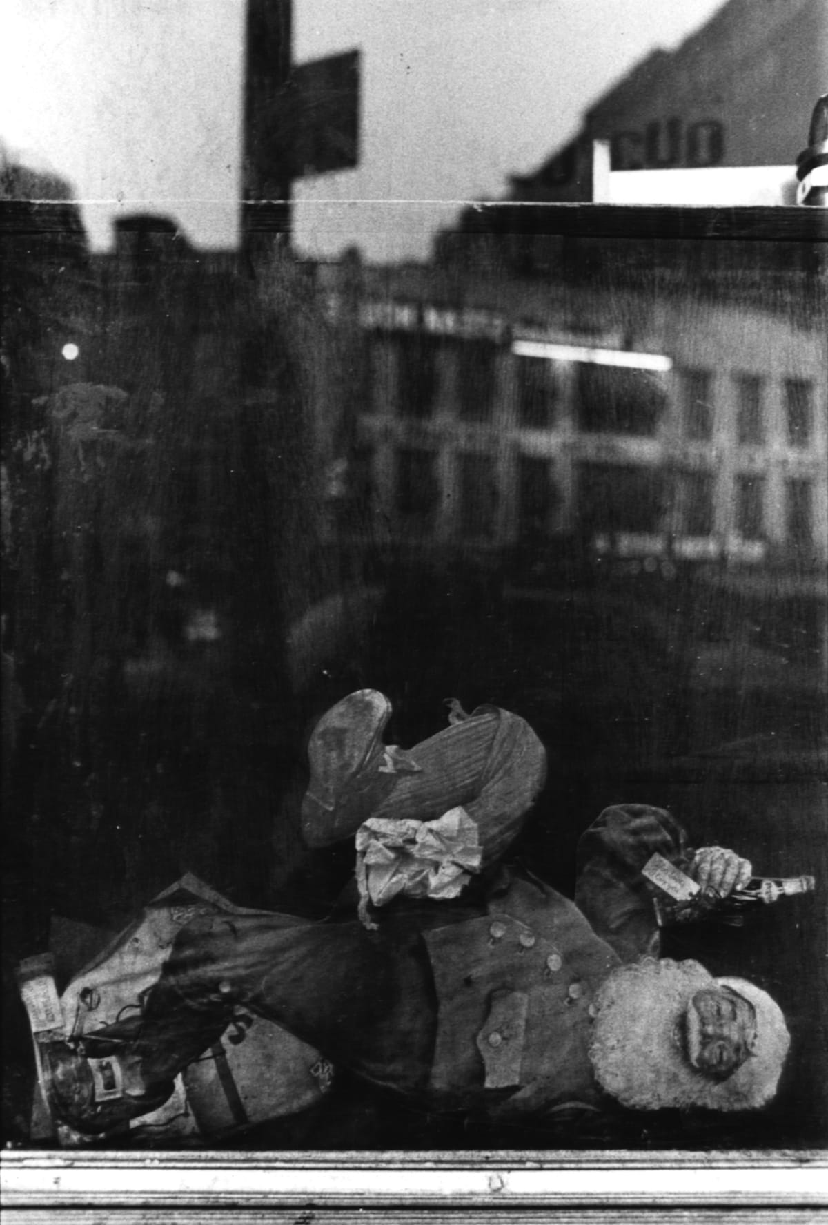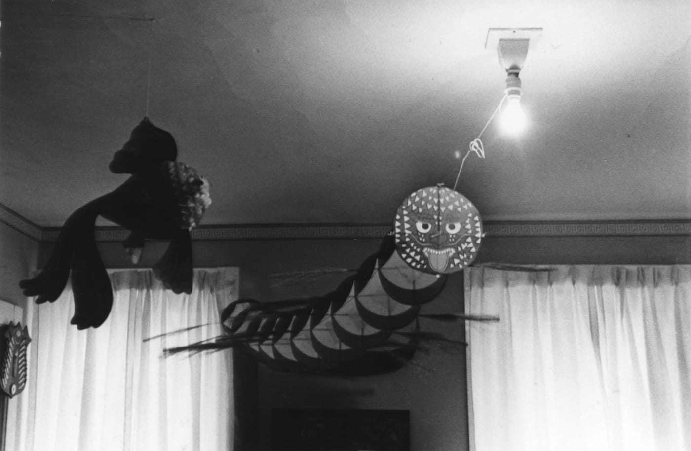 A sense of community, and of individuals who are often isolated within it, is one of Smith’s enduring themes. In the photograph “American Dream” (Harlem, New York, ca. 1972), which is of a large dirty cutout of Santa Claus lying on its side, hoisting a bottle of soda, Smith stirs up a complex of feelings: this is not the white-bearded jolly fatso bringing good cheer. In another photo, “Kites Inside” (Columbus, Ohio, ca. 1972), two kites are suspended from the ceiling of an apartment, near a bare bulb. One kite has a round face with its tongue sticking out, while the other is more of a silhouette, and resembles a turkey falling from the sky. The image is comic and disturbing. Is the bare bulb the closest that the kites get to the sun?