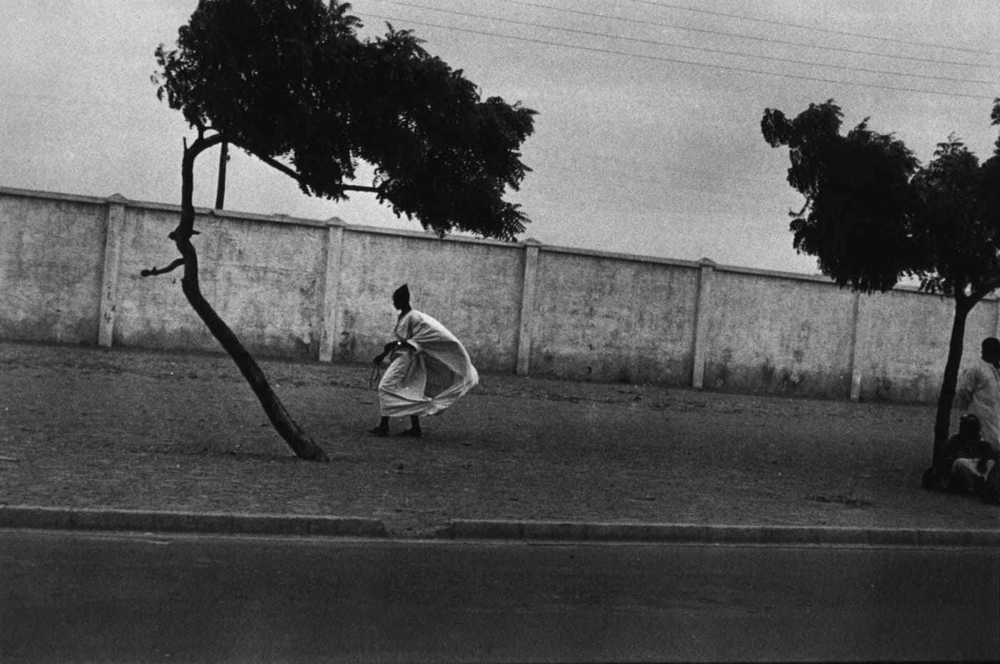 In “Dakar roadside with figures” (Dakar, Senegal, 1972), a woman is walking down the street — from right to left — into a strong wind, and a white cape-like fabric, which is attached to the hem of her white dress and shoulders, billows out behind her, like a sail. A gray wall forming her backdrop spans the length of the photograph, tilting from the photograph’s left edge to its right. The swollen bend of the tree trunk in front of the woman extends to the left, mirroring the swell of the cape, which is arcing to the right, while the leafy crown of the tree reaches over the woman’s head. On the photograph’s far right, two men are under a similar tree, which is perfectly vertical: it is as if there are two weather zones, with the wind between the trees and calmer climes on the rightmost edge. The angle of the wall, the echo of the woman and the tree, and the sense that there are two different weather patterns, are just part of what makes this photograph — its decisive moment — so enchanting. Everything is in tension with everything else; an active moment has been preserved, and the woman has been imbued with sculptural presence. She is a distinct part of this world, and she is in some sense separate from it, the lone citizen of her domain.