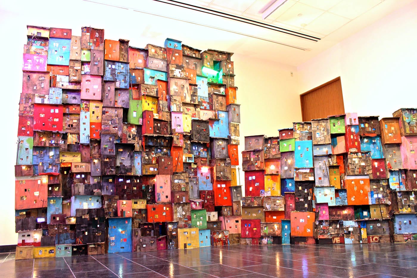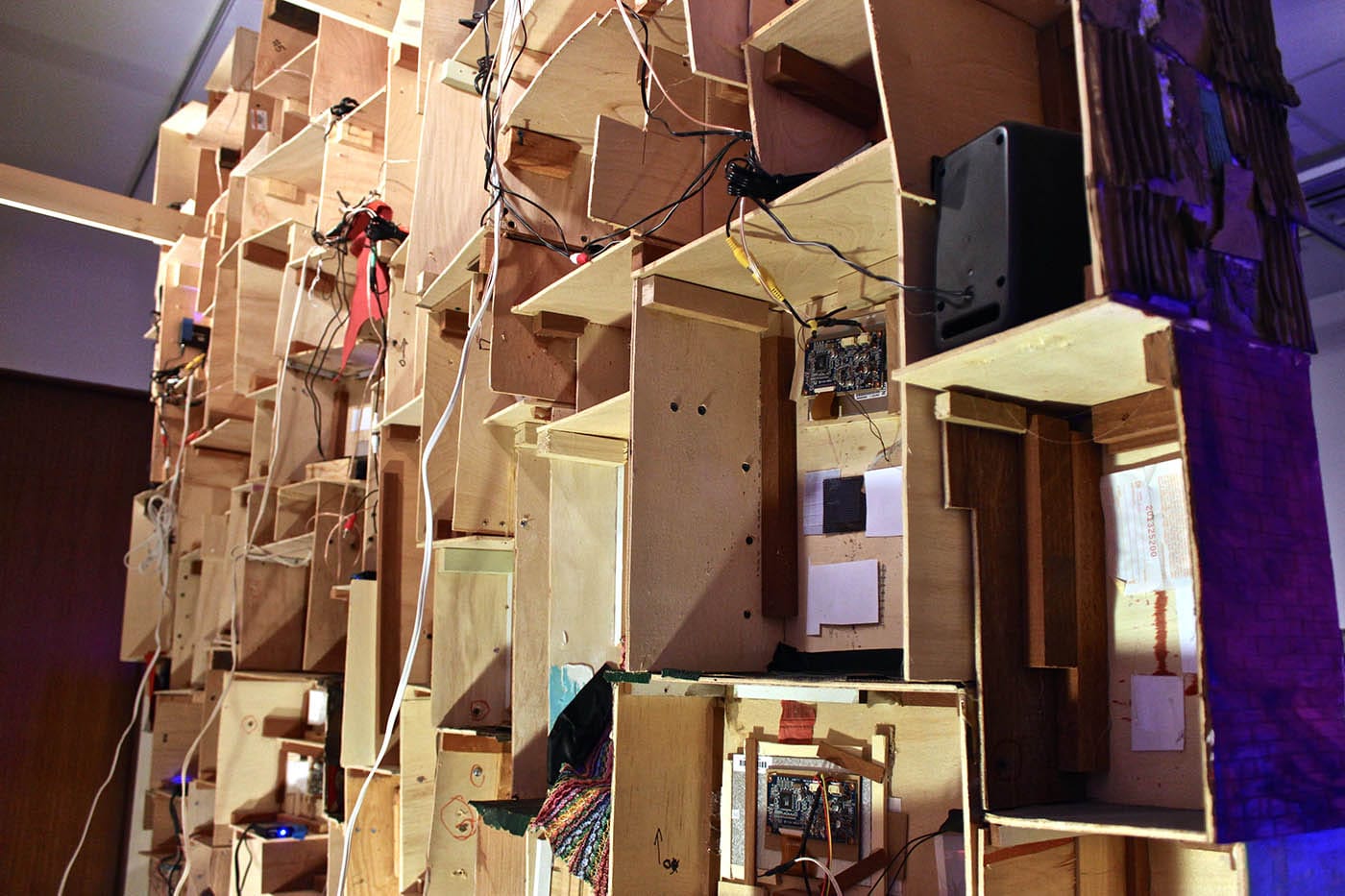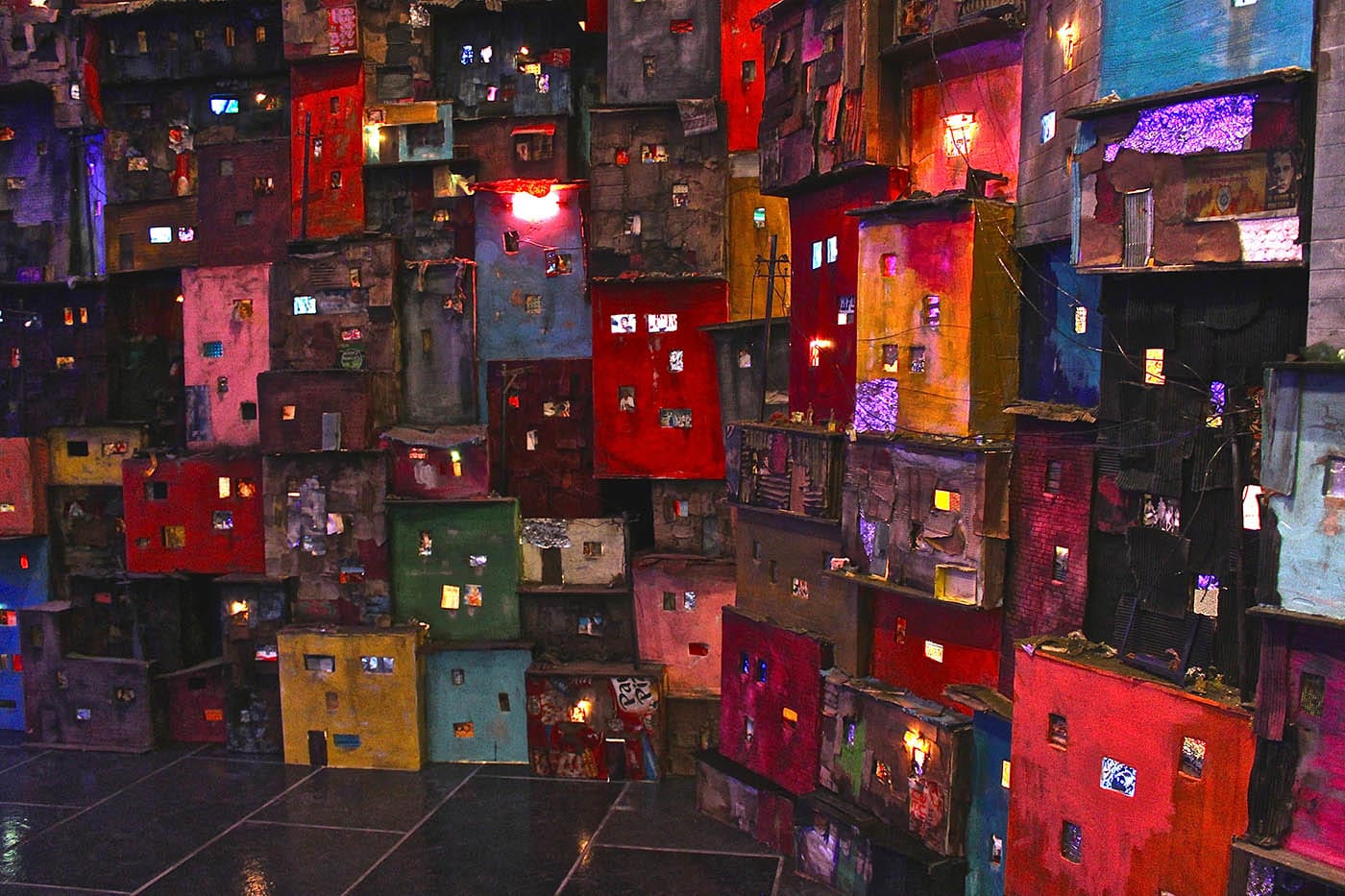 On the surface, “One Thousand Shacks” subverts the natural tendency of miniatures to give one a sense of control; Snelling recreates the churning chaos of life by deftly incorporating kinetic electricity and sound effects in her dioramas. A peek behind the public-facing side of the piece reveals an inner network bristling with multichannel video and audio — the secret life of this diorama is nearly as busy and overwhelming as the 1.5 lives lived in poverty around the world that it means to spotlight.