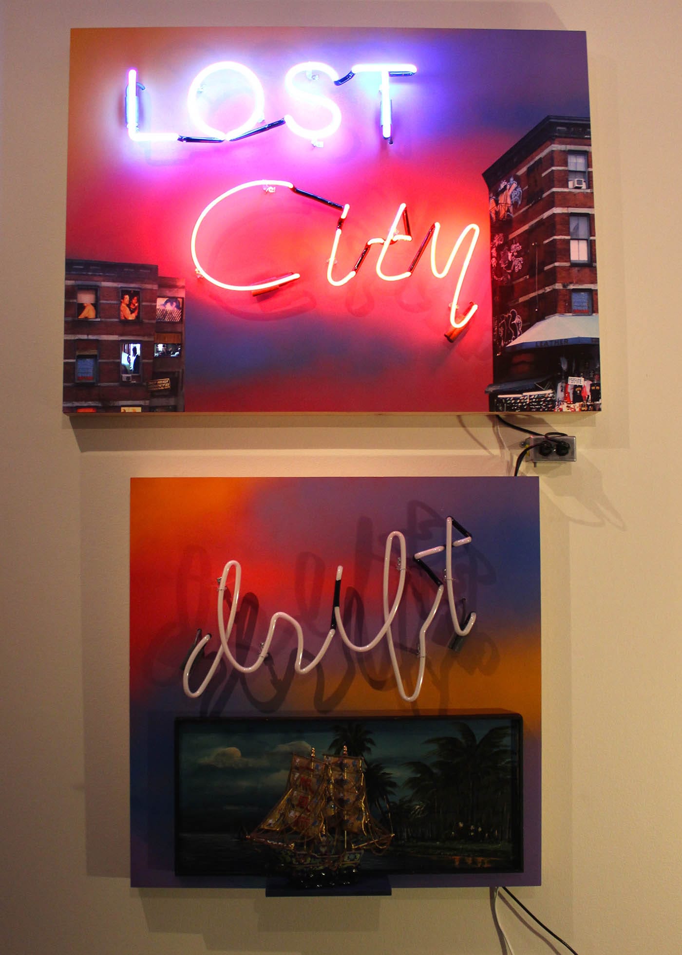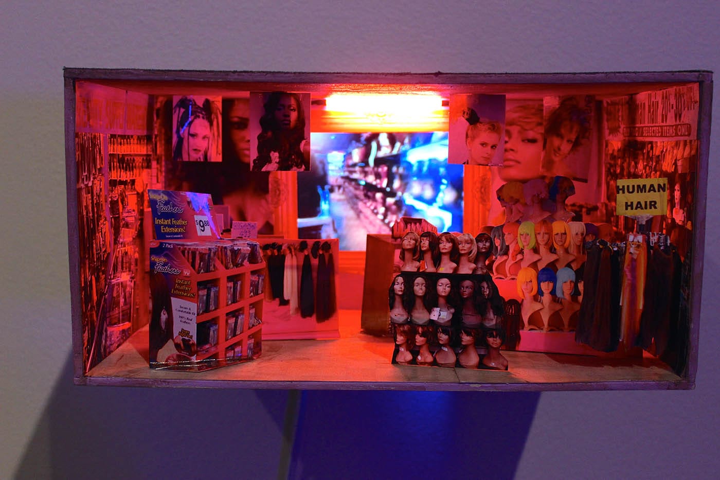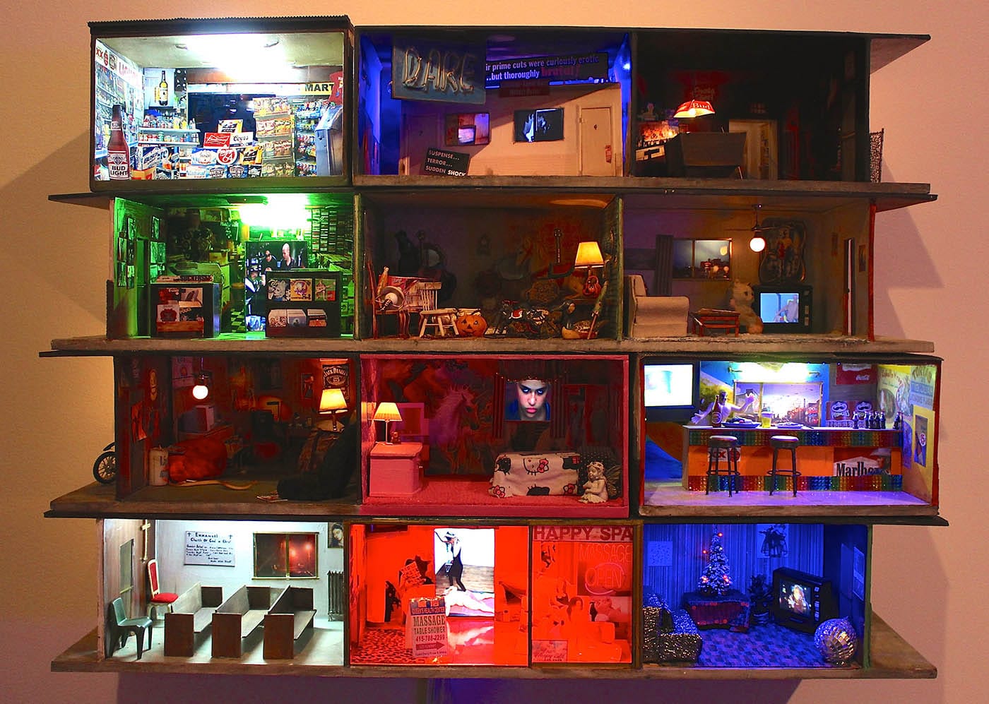 Snelling also created some new work during her residency period at the University of Michigan: a series of small-scale rooms, mounted on the wall in the shape of an apartment building. Each room is a world unto itself, from domestic spaces like living rooms and bedrooms, to public spaces, like a church, to retail spaces like a sports bar, a convenience mart, and a wig shop.