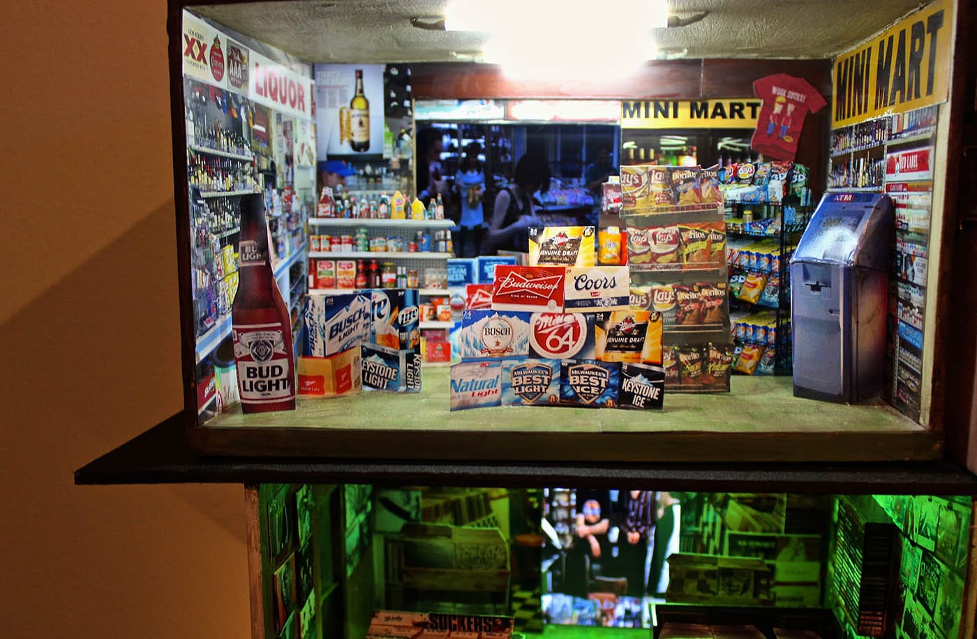 “I feel like all the really rich places are disappearing, so if anything, I would like to document some of the places that I find interesting and build them before they’re gone.” This collector’s urge, this desire to preserve places, like mom-and-pop businesses, strip mall venues, and quiet domestic settings, at a manageable scale is what makes miniatures such an alluring, as well as unironic form. In the case of “One Thousand Shacks,” the repetition of these endless small shanties gives the maker a sense of control over the bewildering notion that 20% of the world’s populations struggles with the condition of poverty on a daily basis. When life at human scale becomes too much or moves too fast, miniatures can help us regain our footing, or find critical distance for these circumstances, without having to walk too far away from them.