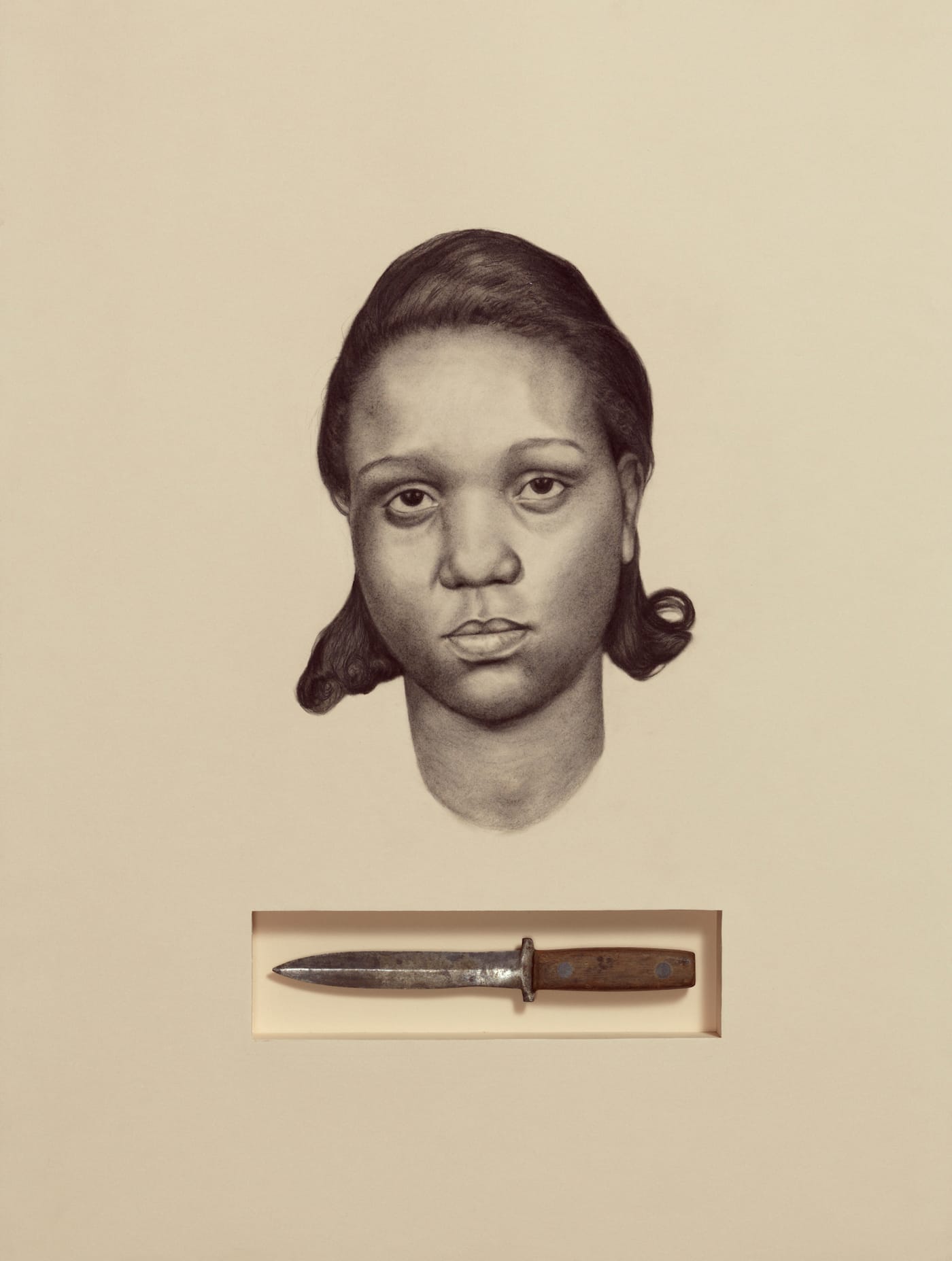 Lovell’s pairings are very deliberate: he may wait years before he finds an object he considers just right for a finished portrait. He shows rather than tells, and the meanings of many of these matches are not immediately clear: the crow in “Kin XLI (Fauna)” (2011), for instance, for me casts an ominous mood over the work as I grapple with what the bird signifies about the man above it, and vice versa. Other pieces have more overt connections, like “Kin XX (Be My Knife)” (2010), where a rusty dagger hints at a young girl’s harrowing history. Lovell’s riddles make us address how we may impose judgment on a group of people who have long battled stereotypes, how textbook histories may diminish their individual humanity. Does the gold chain that hangs below an elegant woman’s profile suggest glamor and affluence, or do we immediately think of enslavement? Displacing his sitters entirely from their original contexts, Lovell revisits history and beckons us, too, to look closely at what colors our perceptions of the past.