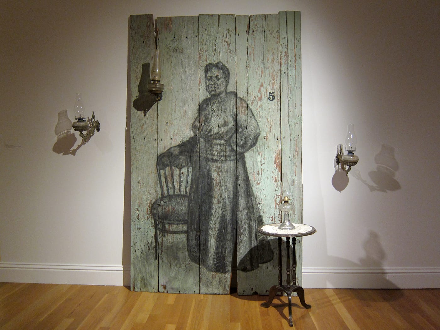 Kin represents Lovell’s most recent works in the Phillips’ exhibition and reveals a turn toward open-ended narratives that demand thoughtful viewing. More evocative are his earlier creations that suggest scenes. They are life-size, often full-bodied, charcoal drawings of African Americans on found, wooden surfaces like doors, around which he places furniture and other objects that immediately inform the settings. Despite the wear of the wood — which anchors the images to the past, like relics, more so than the works in Kin — the figures feel more familiar than the recent crayon drawings. Hovering between sculpture and drawing, the earlier works integrate with our physical space, inviting us to enter private settings likes kitchens, living spaces, and a yard.
