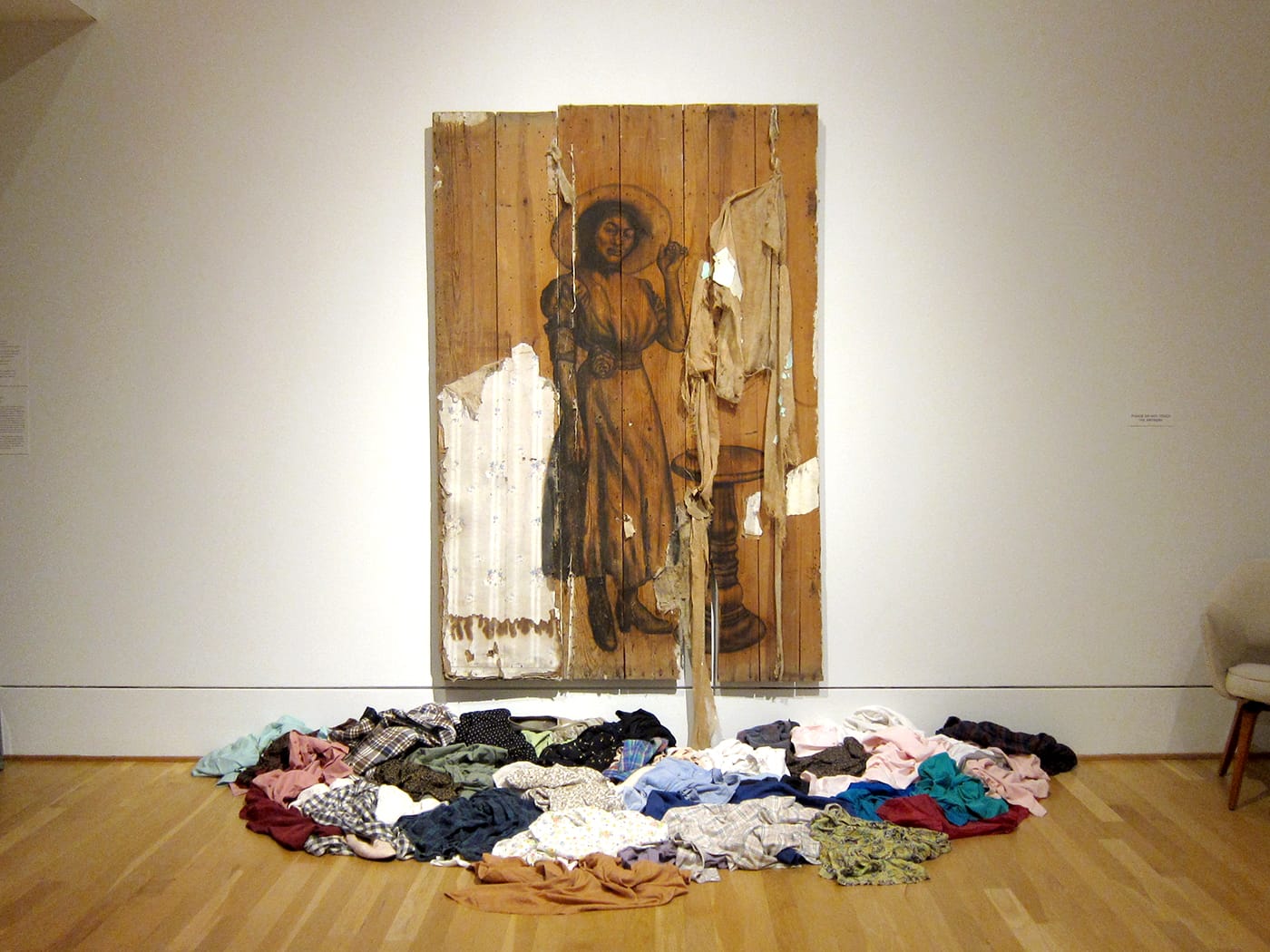Equally inviting is “Rising River Blues” (1999), which features clothing strewn on the gallery’s floor beneath a portrait of a man who is simply standing. A phonograph plays the eponymous tune, with the crackling sound transporting visitors to the early 20th century. The abandoned garb evokes now-absent lives, but the man’s strong presence trumps any melancholic past. His confident expression bestows his life-size figure with perceivable liveliness, invigorated by the evocative music. Lovell’s consuming yet enigmatic scene freezes us in time to confront his anonymous subject, compelling us to wonder who he is, and what his circumstances are.