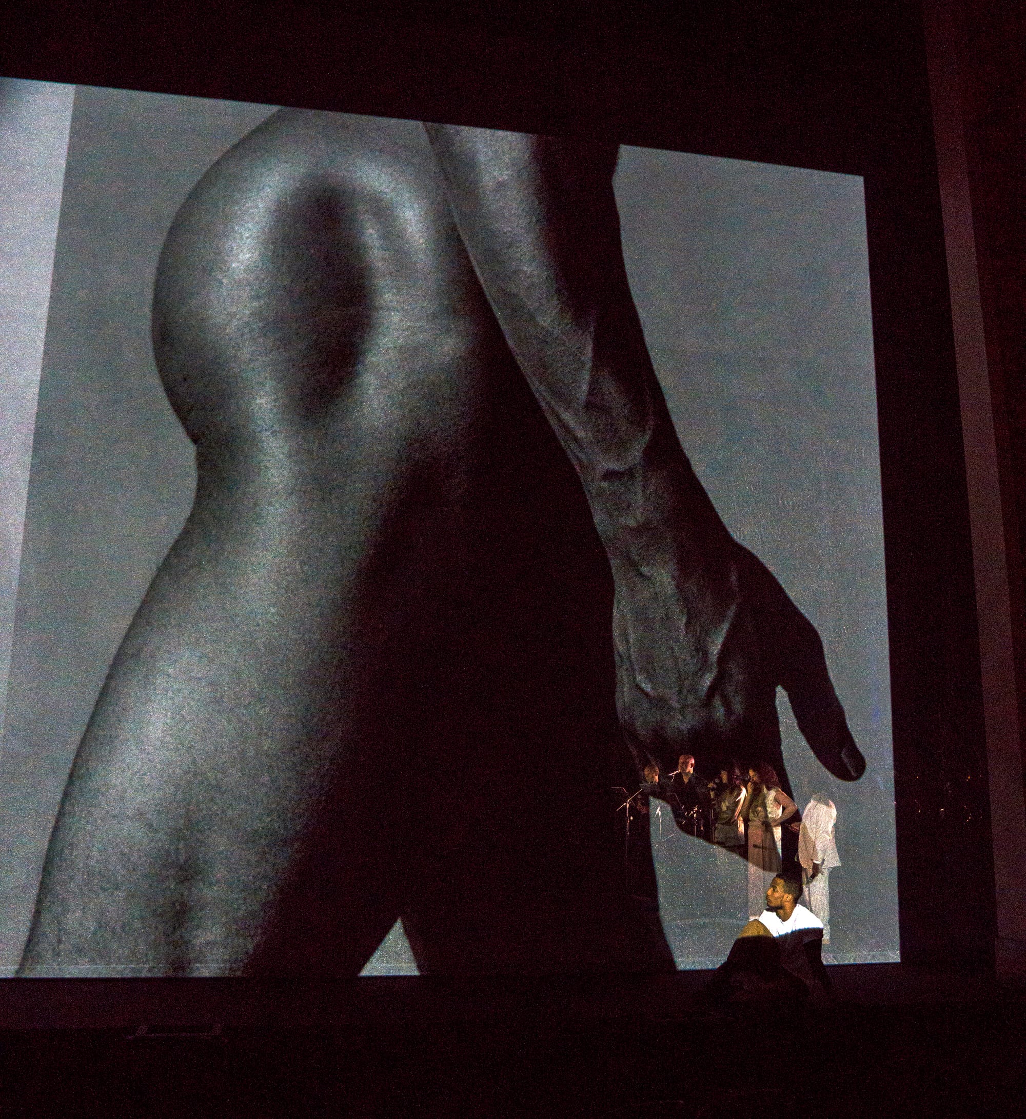 Throughout Triptych, works from Mapplethorpe’s X, Y, and Z portfolios are projected above and around the musicians. Much has been made over the past few years about the fact that his work reads as less scandalous than it once was, but it’s still extraordinary to see the photos in this setting; blown up to cover the proscenium of BAM’s opera house, the photographs’ Renaissance inspirations are magnified. The nobility of queer sexuality that he captured morphs into a sort of religious reverence for the men and women of the AIDS crisis. By presenting them like this, the performance casts the subjects — despite Mapplethorpe’s objectifying intent — as martyrs and saints. It is a tendency that, as other elements of the show compile, eventually becomes overwrought.