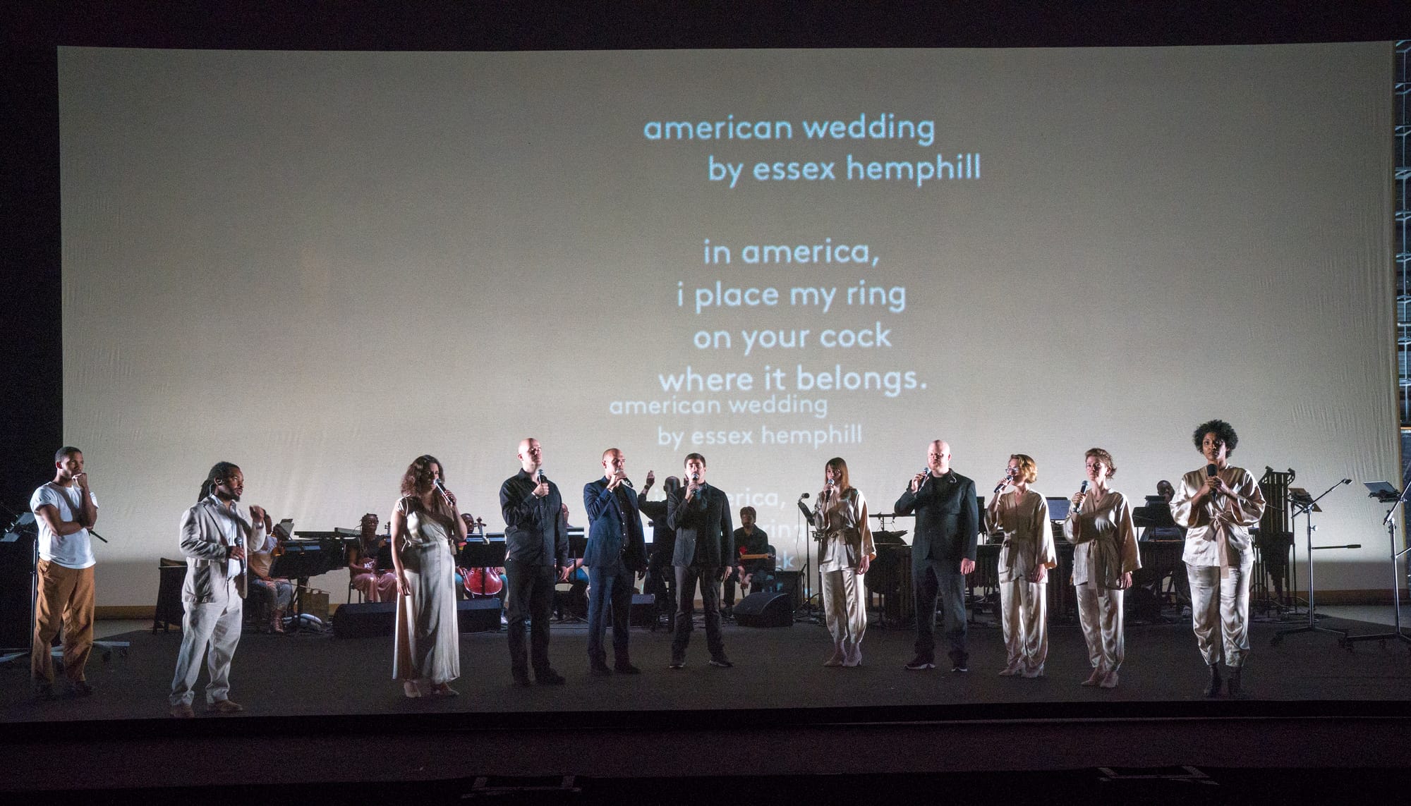 Most awry was the final number, which sets Hemphill’s poem “American Wedding” to a power ballad. For about 5 minutes, the singers repeat a chorus of the text “In america, / I place my ring / on your cock / where it belongs.” It starts as a saccharine line sung by the soloist Isaiah Robinson, and after far too many repetitions becomes an antiphonal chorale intoned by the full vocal ensemble and repeated to the point of madness. Dripping with sincerity in an apparent effort to be oh-so-woke about gay marriage, the music blithely ignores the ironic edginess and bitter social critique of Hemphill’s text. Without the rest of the poem, the line exudes camp. But it didn’t sound campy — it sounded like it was trying to mimic Mapplethorpe’s objectifying reverence for beauty. The result was funny, and not in a good way — it made for a whole less than the sum of its parts.