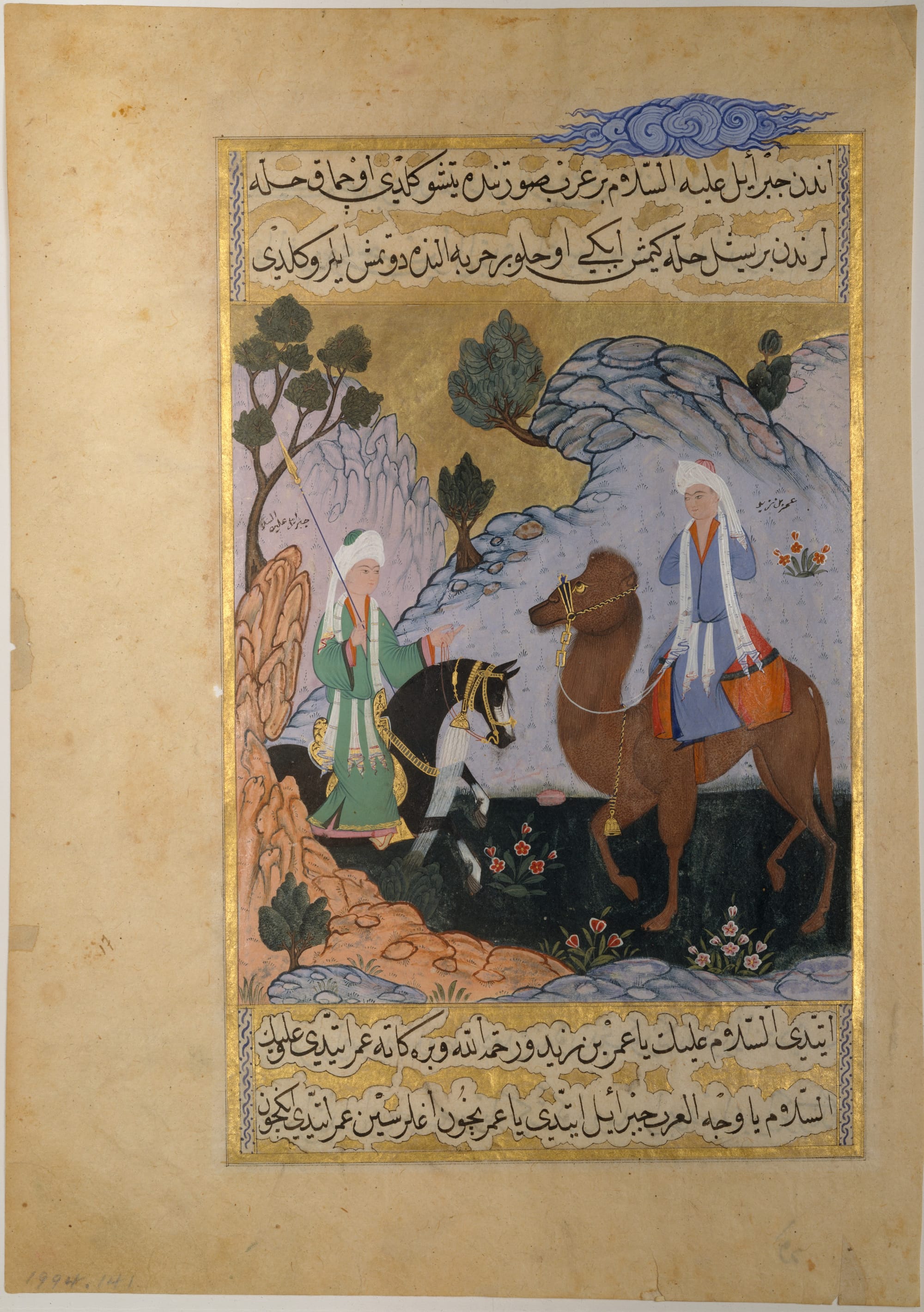 The artwork was identified as a depiction of the Prophet receiving the first revelation from the archangel Gabriel in the Compendium of Chronicles, written by Rashīd al-Dīn in the 14th century. (According to the Oracle and the New York Times, there was also a second work shown, portraying the Prophet with a veil and halo and created by Mustafa ibn Vali in the 16th century.)