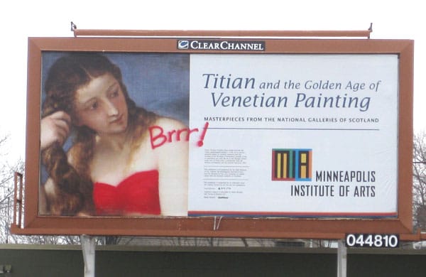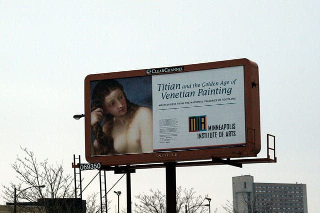 A Minneapolis Institute of Arts (MIA) billboard for the upcoming Titian and the Golden Age of Venetian Painting exhibition got a little wardrobe change earlier this week. The question is, who did it? A street artist or the MIA’s PR team?