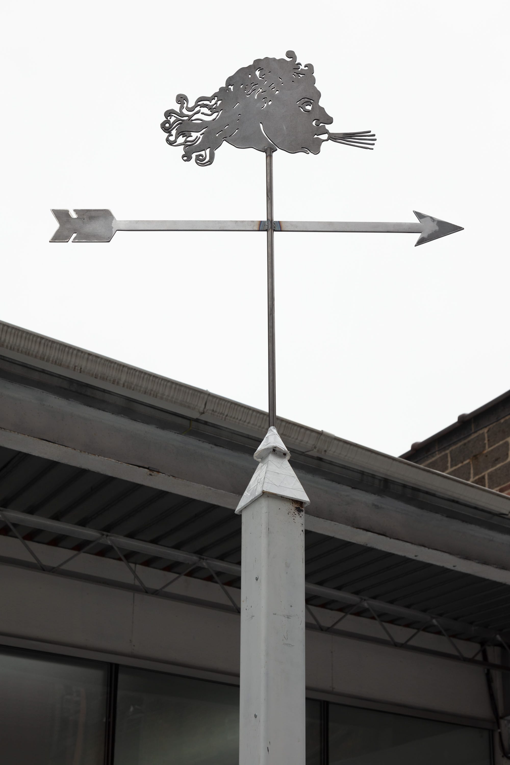 Except for the wall-mounted metallic fans ringed round the room, a bit below ceiling height, Spencer Brownstone Gallery appears empty and still. The small, caged fans hang equidistant from one another and are connected to a weather vane installed in the yard visible just beyond the back wall’s sliding glass doors. Only one or two of the fans blow at a time, in correspondence with the direction of the wind outside. When you cross its path, the secondhand breeze feels like a whisper on your skin.