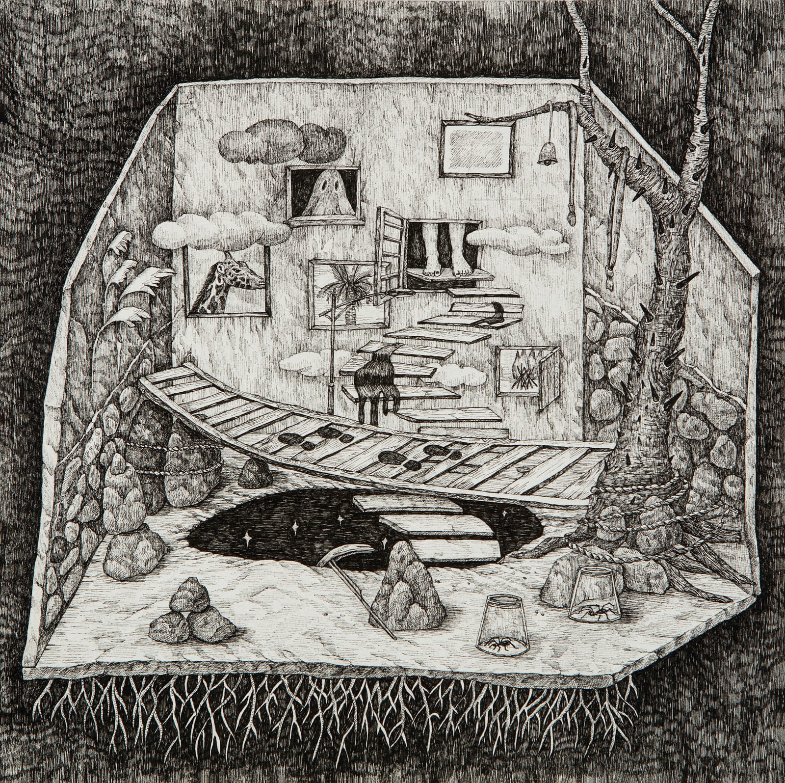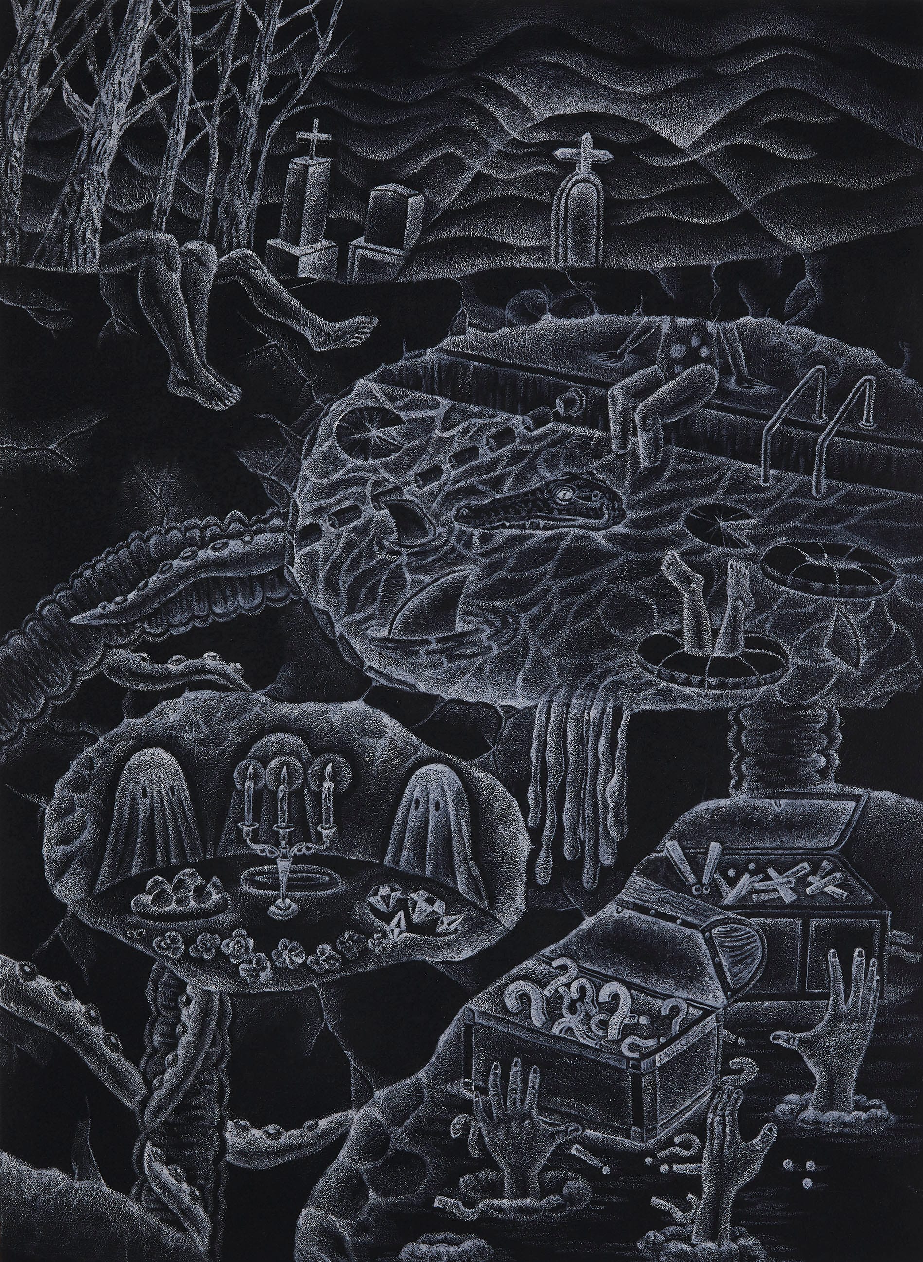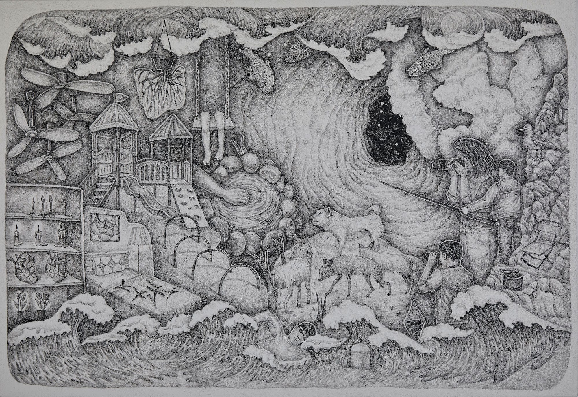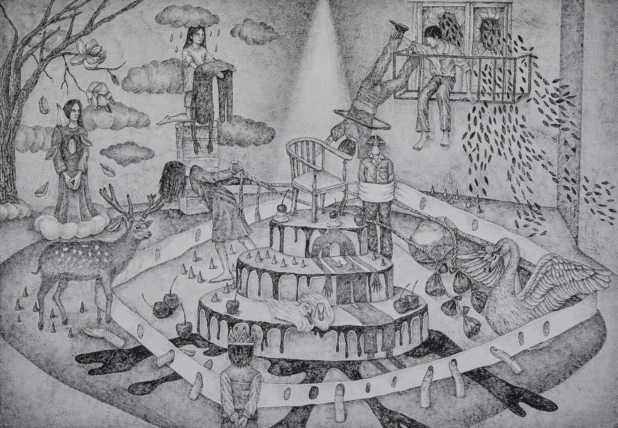 Park’s paintings are essentially large drawings done in black acrylic on a white ground. Precise lines and dark areas made by a dry brush convey shading, volume, and different types of rough surfaces. Park depicts a stage-like setting populated by body parts (hearts, hands, legs), covered in sheets or masked, as well as oddly dressed individuals of different ages, creatures such as deer and swans, observers looking through telescopes or taking photographs, and numerous participants, many of whom are engaged in inexplicable activities: a barefoot young woman dragging a boulder; a uniformed figure sweeping up what appear to be paper stars. The architectural setting of each scene is different, as if to say that you cannot step into the same dream twice.