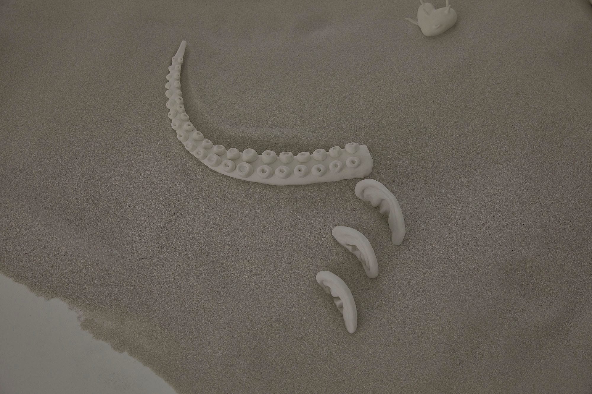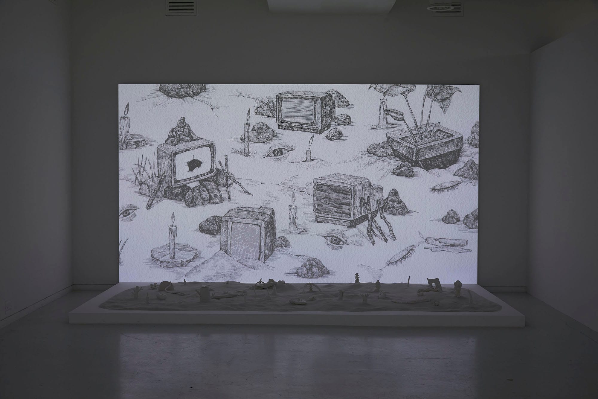 The sinister and miraculous occur simultaneously in Park’s fully realized, imagined worlds. In the drawing animation “Interlude” (2022), a 4-minute 20-second video is projected on one gallery wall above “Cut Off Senses,” a sculptural installation consisting of identifiable and unidentifiable ceramic body parts partially buried in a bed of sand. Are these body parts remnants of an unknown catastrophe? How does this work link with the video playing above it? At the beginning of “Interlude,” which has an immersive soundtrack by the composer/sound artist Hyemin Seo, a curtain rises on a field of black lines, which is followed by a barren landscape littered with broken televisions, large blinking eyes embedded in the ground, and candles with swaying flames. The scene zeroes in on the television in the center of this landscape, its screen projecting moving black lines, signaling it is on the fritz. Soon its screen fills the entire view and transforms into a watery world in which the faces of two women float, eyes closed. Ducks and lily pads surround the faces. Eventually everything drifts out of the frame, leaving only the water, which slowly fills with different-sized rocks. Snakes enter from the edges, linger briefly, and then leave. These and the episodes that follow seem linked, but not necessarily logical nor decipherable.