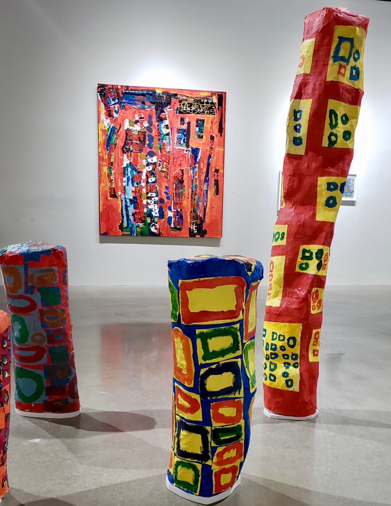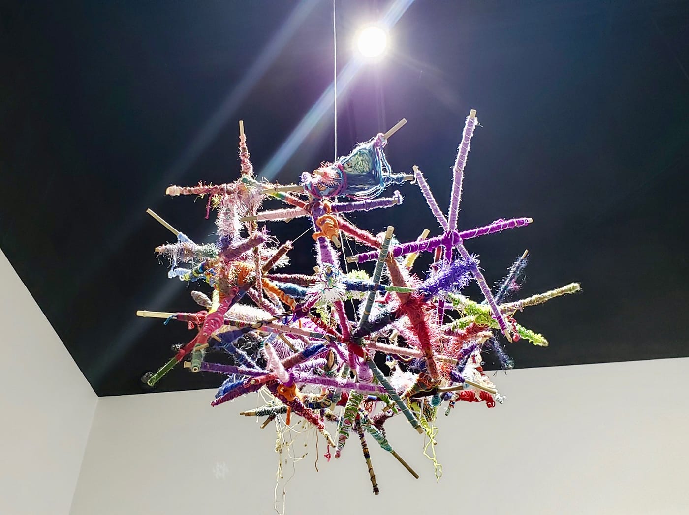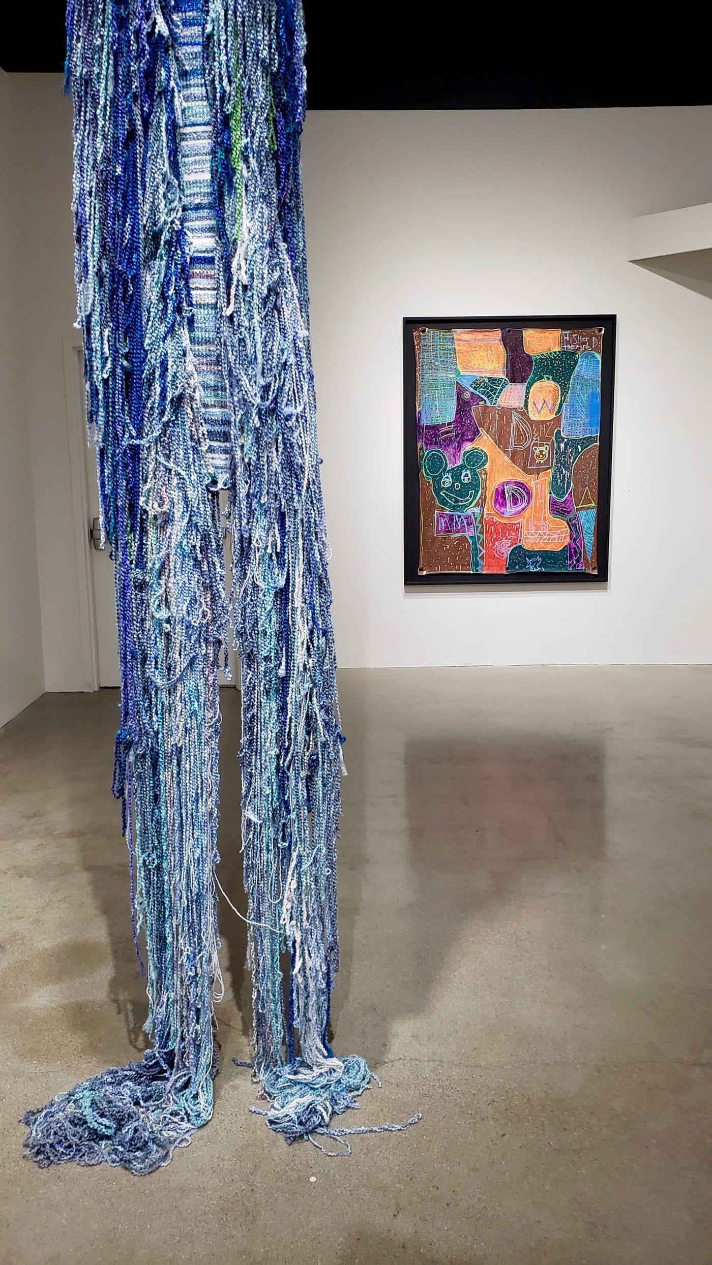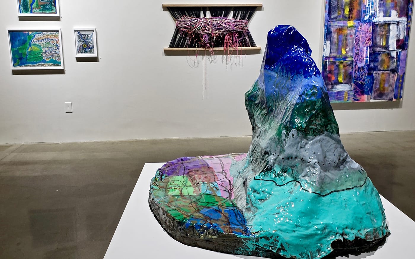 Four pieces from Rachel Fallert’s Fingers series (2019) stand near the front of the installation space. These brightly colored forms made of painted papier-mâché over a wire framework could indeed be a set of uneven and muppet-like fingers, but they also recall a kind of cartoonish skyline, especially with Aislinn Wendrow’s “This is Sew Abstract!” (2019) in the background. The latter’s title presumably alludes to Wendrow’s recent practice of collaging her painted and repainted canvases with paper and tape elements using thick, colorful thread. Nearby, dramatic fiber pieces extend from the floor to the ceiling in the vaulted Center Galleries space. An incredible cascade of woven yarn by Stephanie Harris, titled “Muppets of Walt Disney World Orlando Florida” (2018), mirrors an equally tall net made from a rainbow of wire-strung beads by Alyssa Gold. This piece, titled “Beady” (2018), combines a brilliant mélange of prefabricated elements, punctuated by the occasional original bead handmade by Gold in glazed ceramic — tactile flourishes in the colorful, irregular mesh of the net. Gold hangs her nets as early as possible in her working process, valuing them as objects that she can hear and sense in her space — grids that tether her to the physical environment.