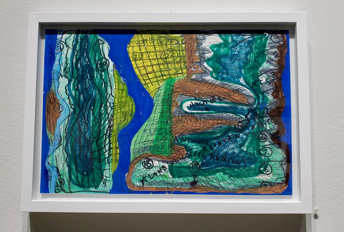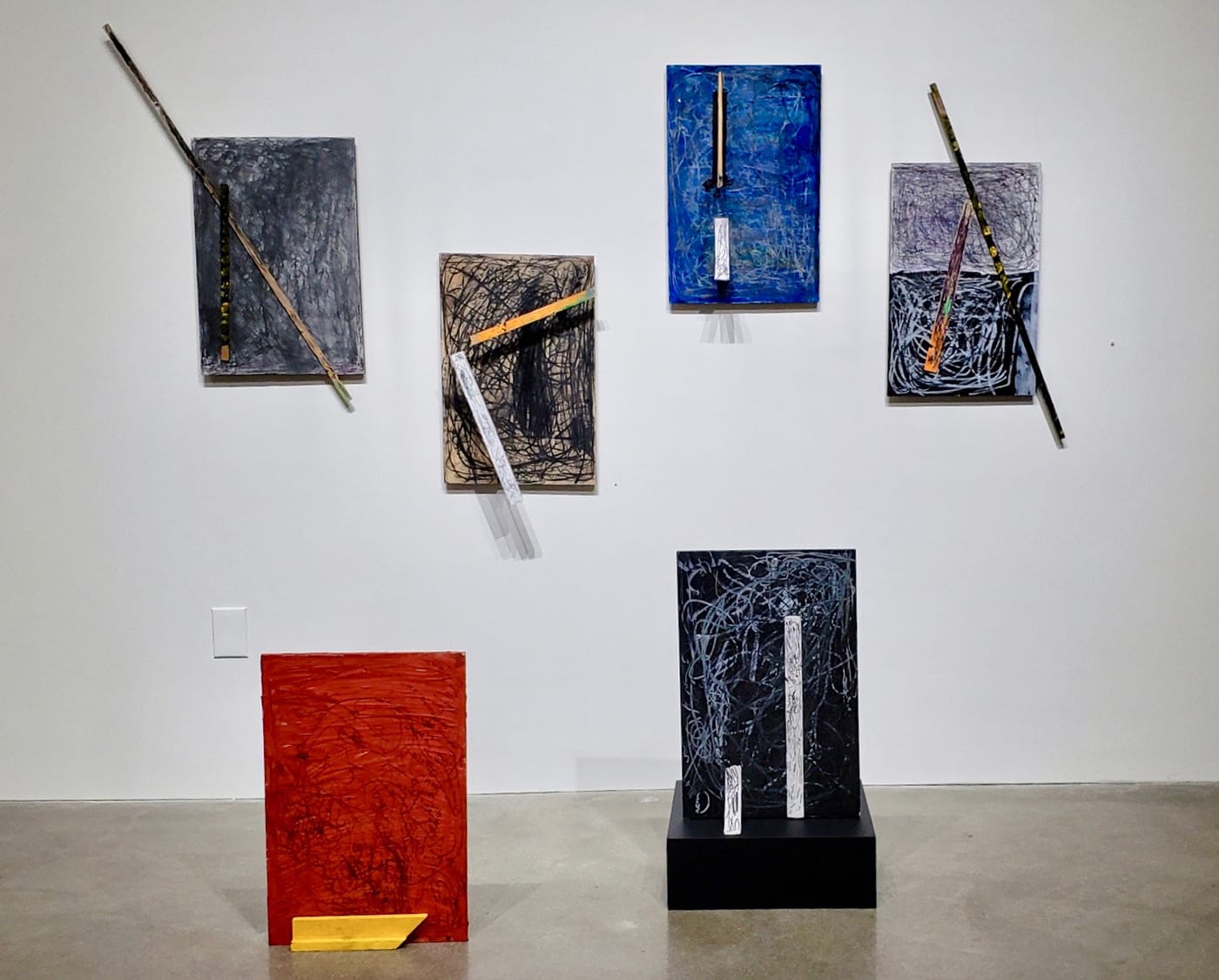 I could continue to expound on the individual works — the coarse, delicious pointillism of “Dot Universe” (2018) by Jason Luckoff; Jacob Barron’s small, tombstone-like monuments made from found and cut scrap wood and assembled, along with a stream-of-consciousness narrative, into “journal pages”; the evocative and vulnerable little papier-mâché “Huckleberry Mountain” (2018) by Brian Nanry, whose work is largely inspired by alien landscapes — but perhaps it’s time for the reveal. All the participating artists belong to the same studio, and it happens to be one with a mission.