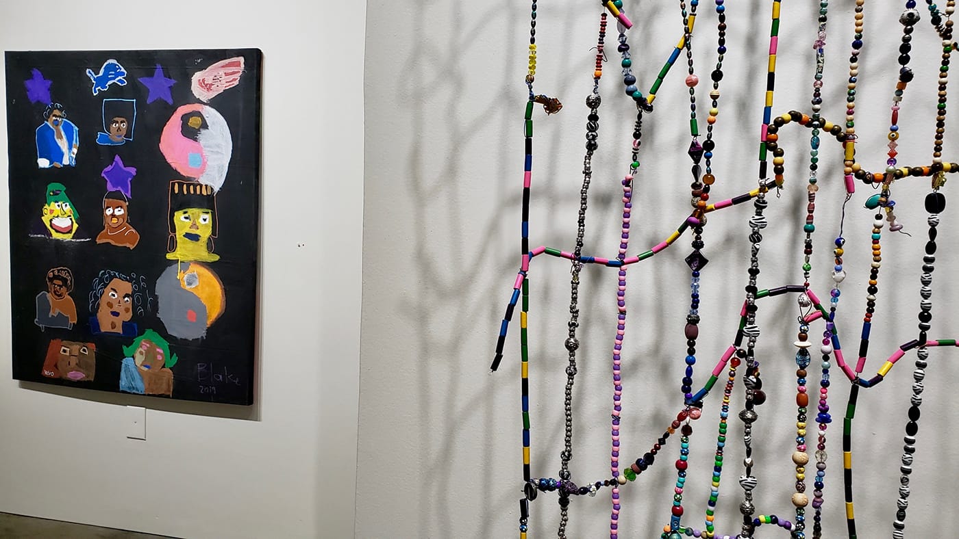 In an exhibition rife with abstraction and tactile objects, Blake Jackson’s large-scale painting, “My Wives” (2019), is among the few figurative works; it conveys the artist’s sense of humor as well as his passion for his female subjects, which include Queen Latifah, Monique, and other black cultural icons. The group portrait features nine women, rendered as heads or busts floating against a black background, with some yin-yang symbols, purple stars, and local sports team logos thrown in for good measure. The quasi-primitive style is offset by the detail, creating an arresting tribute to the things and people Jackson loves.