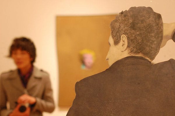 Last year’s retrospective show devoted to Michelangelo Pistoletto at the Philadelphia Museum of Art and the exhibition catalogue published by Yale offer a point of departure for considering the problem. Begun well before his association with the Arte Povera movement and created throughout the 1960s and early 70s, Pistoletto’s mirror paintings present viewers with reflections of themselves within the painting’s frame. The artist applied photographed images to polished stainless steel surfaces and thus created “canvases” in which the viewer is viewed. Next to one of the artist’s scaled, photo realistic human figures, the gallery-goer can pose, brood or cavort with the simulacra, even as other live subjects likewise enter the frame.