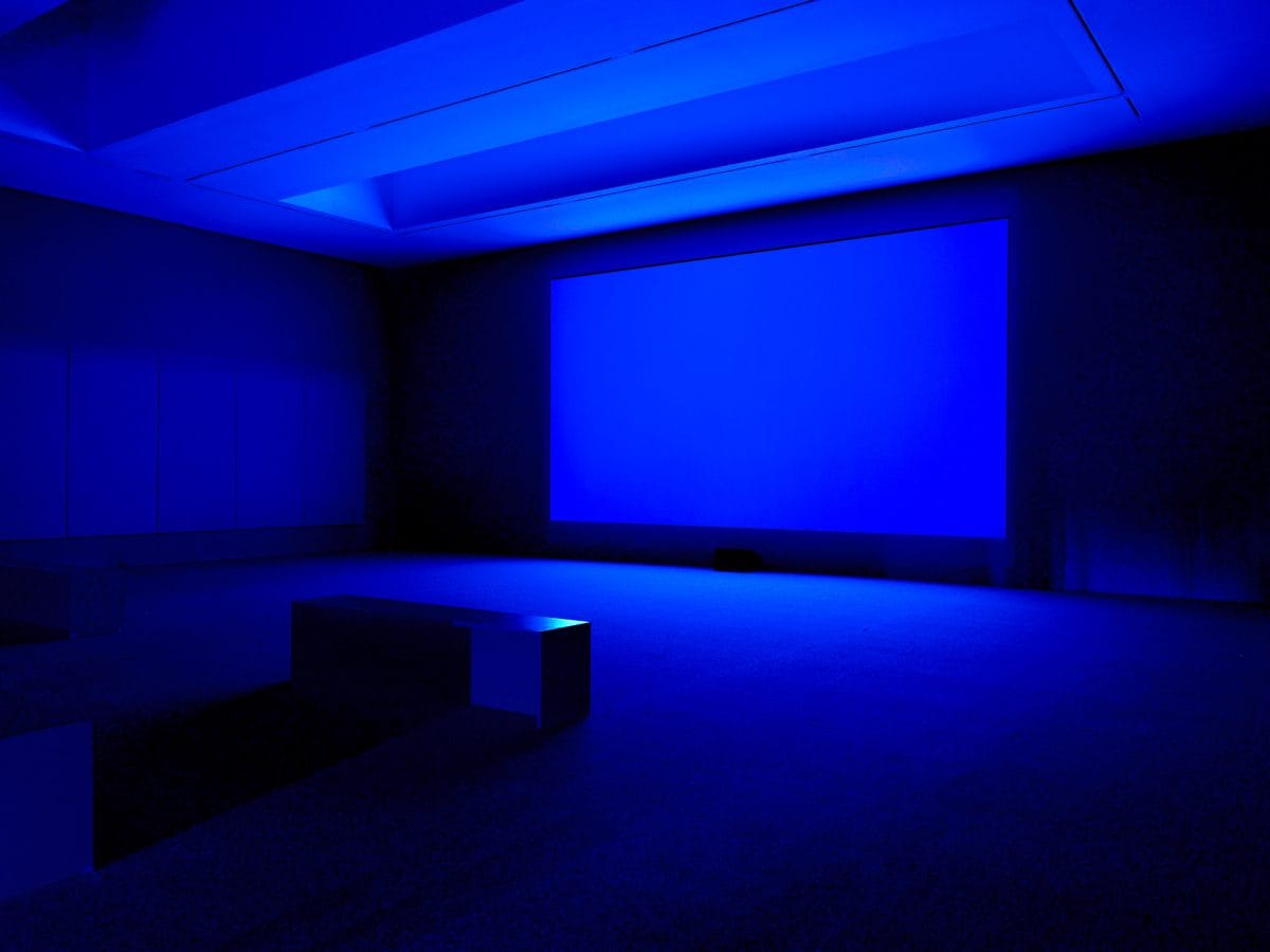 Still, the exhibition continues with another piece by Jarman, a grey curtain leading into his most celebrated film Blue (1993). A monochromatic screen radiating Yves Klein Blue (Jarman experienced a temporary blindness that caused flashes of blue to sporadically appear in his eyes) is overlaid with several voices, including the artist’s own, reading a poetic meditation on illness, mortality, and the AIDS crisis. The work certainly holds its own at Zwirner; soaked up by the blue, you forget where you are.