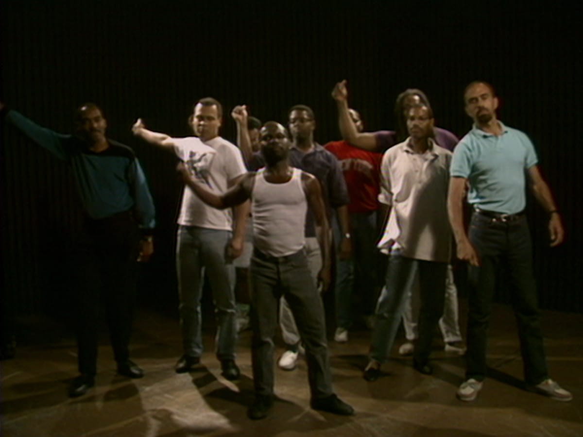 The same is true for Marlon Riggs’s iconic documentary Tongues Untied (1989), which can be viewed in a separate space a few doors down, on the largest screen I’ve ever seen it. The piece is an essayistic montage of poetic monologues and testimonies by Black gay men, including the poet Essex Hemphill and Riggs himself, skillfully interwoven with archival footage capturing scenes of performance and protest. Giving voice to his community while also re-enacting the violent hate speech directed at them, Riggs exposes the deep wounds of homophobia and racism in our society, all the while urging that “Black men loving Black men is the revolutionary act.”