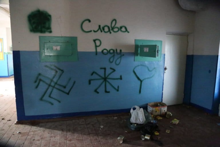 An inscription by the Russian military reading "Glory to the Generation" and an image of a swastika on the wall at a school in the Kropyvnia, Kyiv region (image courtesy Pavlo Smovzh)